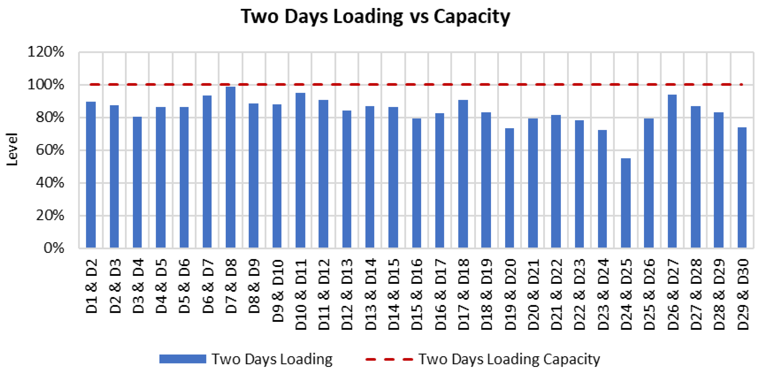Figure 12 illustrates the two consecutive days’ loading volumes against the two consecutive days’ capacity.