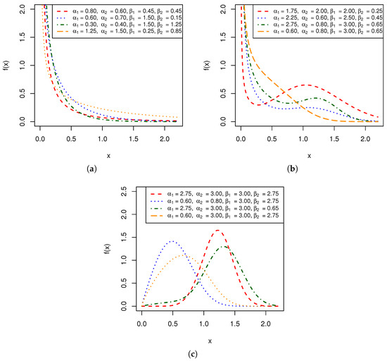 where is the gamma function, while is the upper incomplete gamma function, respectively. Note that this study considers only two competing risk factors (i.e., ) without loss of generality. A re-parameterized and extended logarithm of the distribution of the GG random variable was developed by [38]. Recently, a new partially linear regression based on a reparametrized generalized gamma distribution with two systematic components that can be easily interpreted was established by [36], while ref. [37] presented the flexible GG distribution with a PDF that can be expressed as an infinite linear combination of generalized gamma densities, and ref. [39] rehabilitated maximum likelihood (ML) estimation for the parameters of the GG distribution via a modified MLE to deal with computational difficulties, including, but not limited to, non-convergence or convergence to the wrong root for the normal equations.