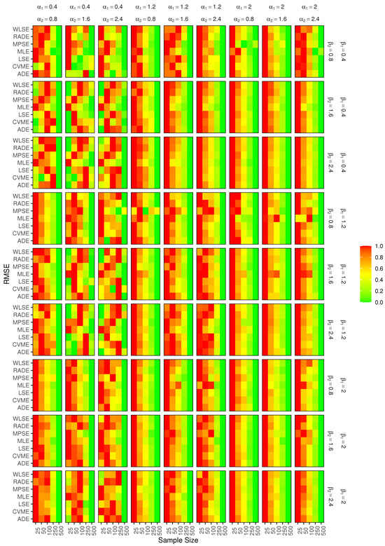 A comprehensive Monte Carlo simulation analysis is conducted to numerically analyze and compare the efficacy of the proposed estimators under different combinations of sample size n and different parameters values of where the parameters , and affect the shape of the distribution while the scale parameters and control the spread of data, stretching the distribution along the x-axis rather than changing its fundamental shape which is basically controlled by the parameter shape. The simulation results are categorized into two sections: the first section assesses the efficiency of estimators, while the second section focuses on goodness-of-fit analysis for each estimation method. In the simulation, the sample size is designated as ; moreover, the parameter values were set as , and with the scale parameters maintained at without loss of generality. The simulation outcomes are based on simulation iterations. All numerical results were obtained using RStudio 2024.12.1 [71], an integrated development environment (IDE) for R 4.4.3 [72], a language and environment designed for statistical computing, visualization, and analysis. Due to its versatility, R includes numerous built-in functions for optimization, in addition to a wide range of contributed packages. One such package is nloptr 2.2.1, which serves as an R interface to NLopt 2.10.0, a free and open-source library for nonlinear optimization. NLopt provides a unified interface to various freely available optimization routines, as well as original implementations of several algorithms [73]. Among these is the Bound Optimization by Quadratic Approximation (BOBYQA) algorithm [74], which demonstrated strong performance in obtaining the estimators.