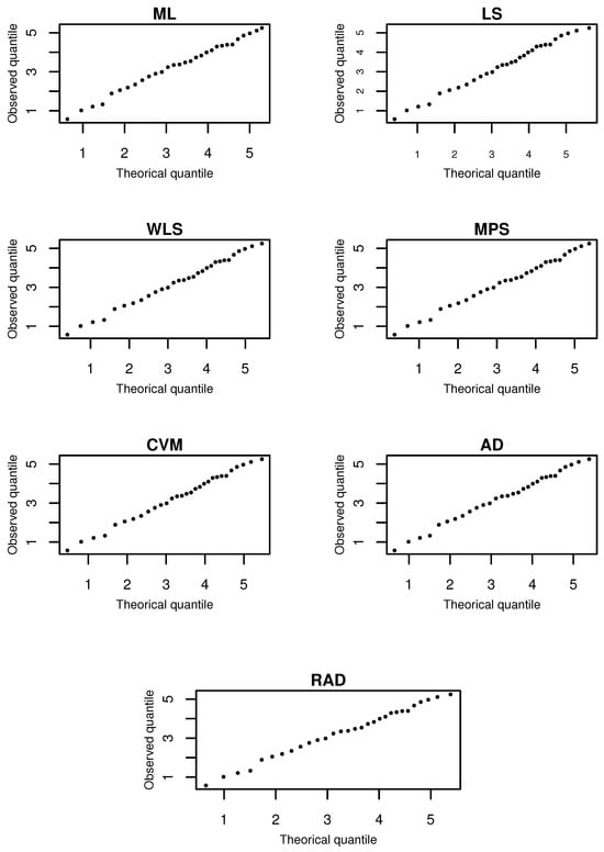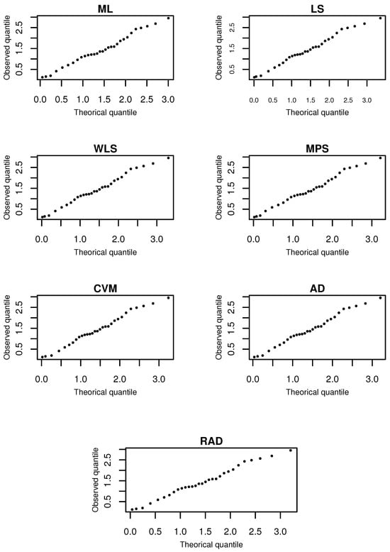 The results of goodness-of-fit tests are shown in Table 13, while the Q-Q plot is shown in Figure 12. All methods produced adequate distributional fits according to test statistics, but AD showed outstanding performance based on the corresponding p-value and MCSE.