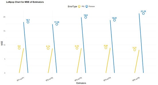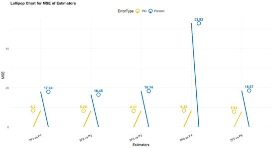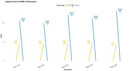 As illustrated across Table 2, Table 3, Table 4, Table 5, Table 6, Table 7, Table 8, Table 9 and Table 10, the simulation-based findings and empirical-based findings of the proposed P-IG regression-based mean estimators, which are identified as , show that compared to the traditional Poisson regression-based estimators, which are represented by , the former has a clear advantage in not only the overall MSE but also the PRE.
