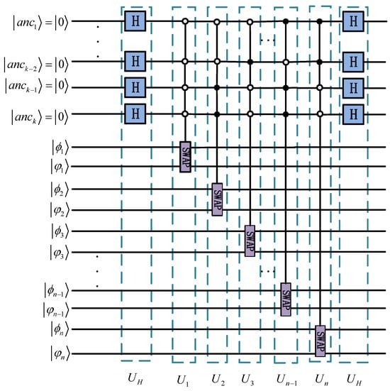 The multi-qubit swap test [] is a quantum algorithmic primitive that generalizes the standard two-state swap test. Its purpose is to evaluate the collective similarity between n pairs of quantum states. Specifically, for n pairs of qubits , this provides an estimate of the modulus squared sum of their inner products, . The quantum circuit of the multi-qubit swap test, illustrated in Figure 1, requires k ancillary qubits, where .