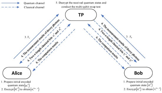 A pivotal subfield within cryptography is secure multiparty computation (MPC) [], which enables multiple parties to jointly compute a function over their private inputs while preserving the confidentiality of those inputs. The classic “millionaires’ problem” [] is a quintessential example, allowing two parties to compare their wealth without disclosure. Subsequent work extended this to equality checks [], a fundamental building block for more complex protocols. However, traditional solutions based on computational hardness assumptions are critically threatened by the advent of quantum algorithms, notably Shor algorithm [] and Grover algorithm []. This vulnerability has catalyzed the development of quantum private comparison (QPC) protocols, which integrate classical comparison tasks with the inherent security of quantum mechanics.