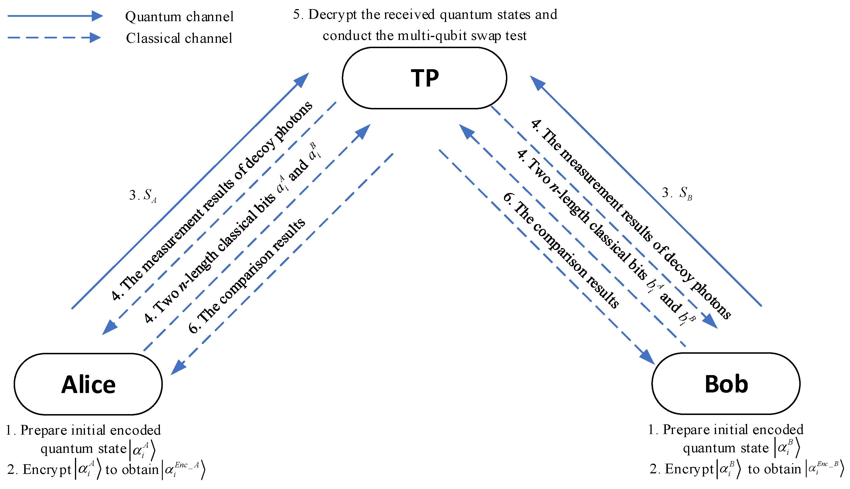 - Huang, X.; Zhang, S.B.; Chang, Y.; Hou, M.; Cheng, W. Efficient quantum private comparison based on entanglement swapping of bell states. Int. J. Theor. Phys. 2021, 60, 3783–3796. [Google Scholar] [CrossRef]