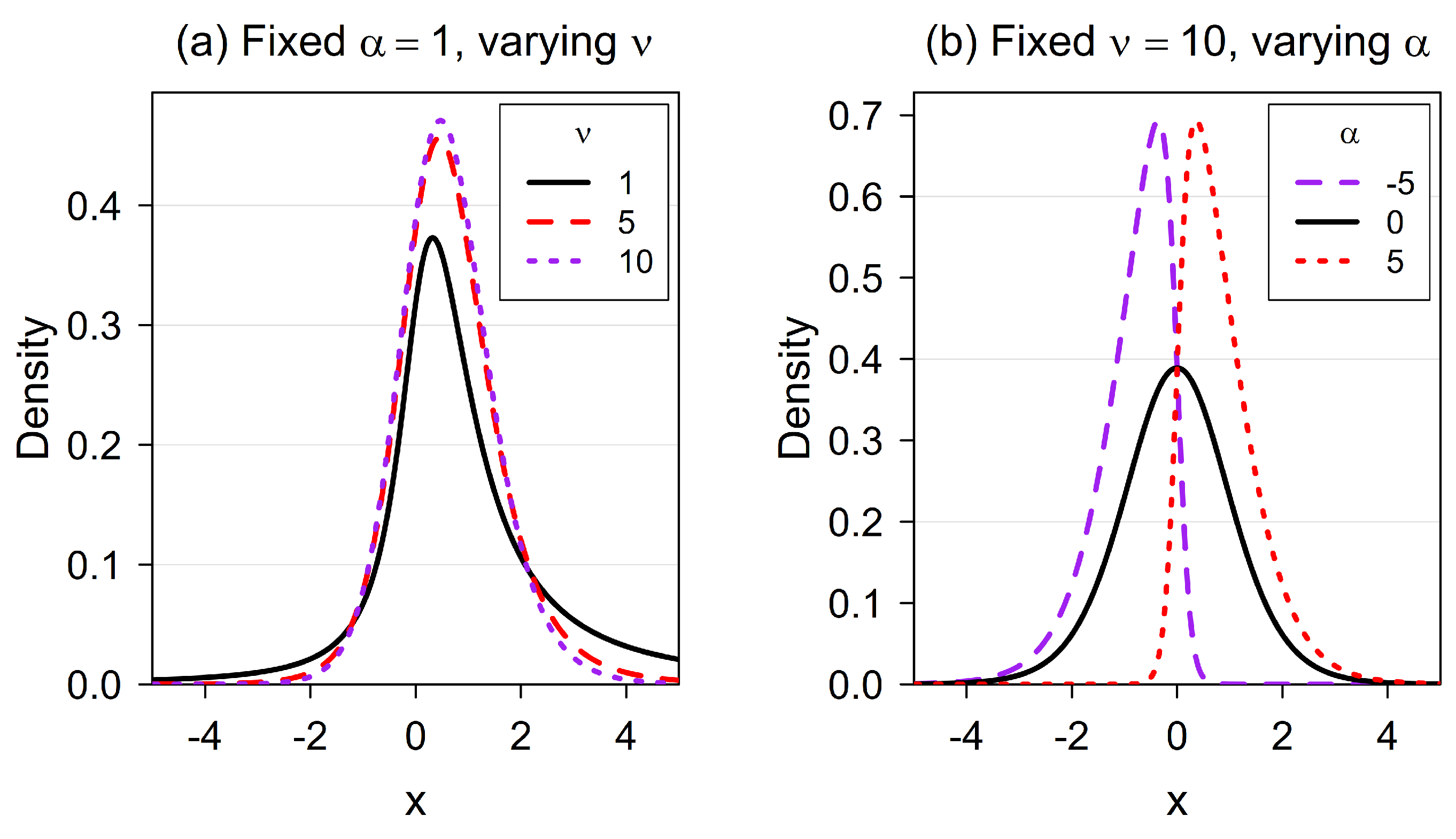 6]). By augmenting the normal distribution with a skewness parameter, the Skew-normal preserves analytical tractability while allowing for controlled departures from symmetry. However, because the Skew-normal remains light-tailed, it is ill-suited to settings where leptokurtosis is intrinsic to the data-generating process.