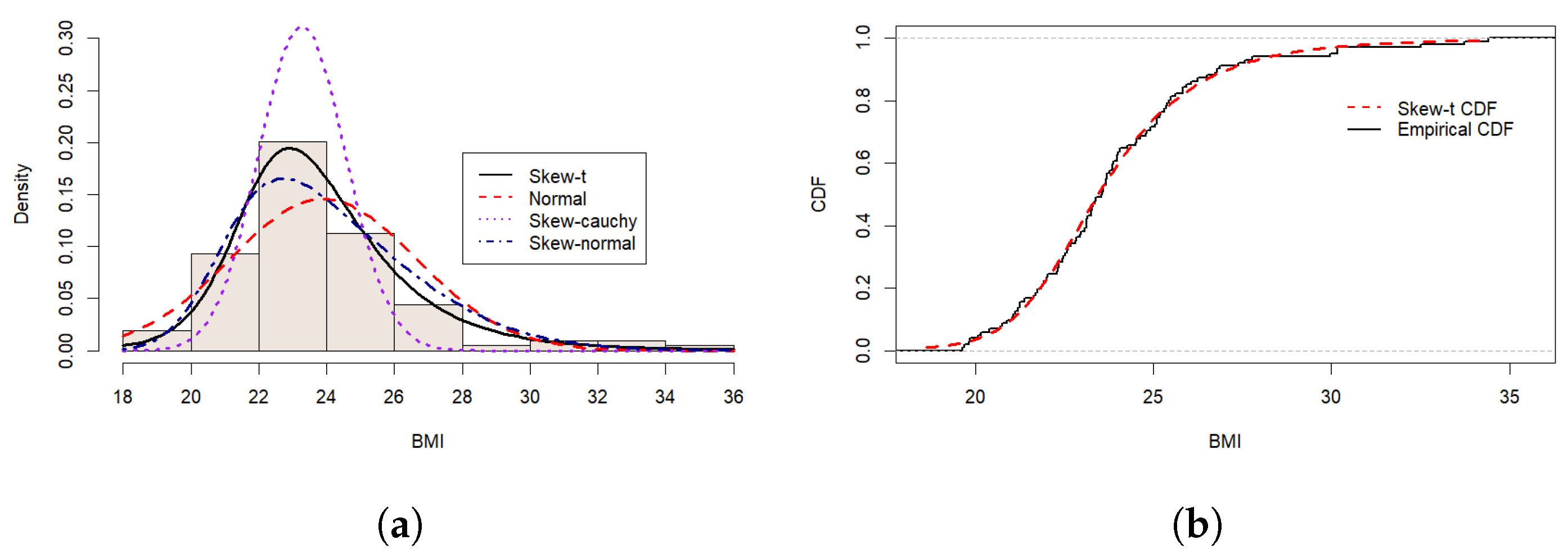 In all datasets, the Skew-t distribution yielded the lowest AIC values, indicating a better overall fit. Surprisingly, the Skew-normal distribution gave a lower SIC value for the body mass index (BMI) dataset. In addition, the associated p-value (0.0502) for the likelihood ratio test (LRT) indicates some evidence that the data may follow Skew-t distribution. Other likelihood ratio tests (LRTs) yielded small p-values, suggesting strong evidence in favor of Skew-t distribution.