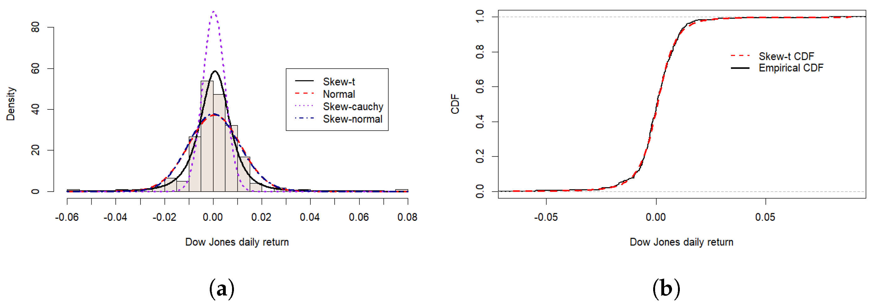 In the first dataset (BMI), our proposed test statistic is 1.7109, with a corresponding p-value of 0.5840, supporting the assertion that the BMI data follow the Skew-t distribution. Classical tests considered in the study also supported the null hypothesis that body mass index (BMI) data can be modeled using the Skew-t distribution. In the second dataset, the test statistic for the proposed procedure is 3.9635, and the corresponding p-value is 0.5473. These results support the fact that the data follow the Skew-t distribution. Similar results are observed for the classical (EDF) tests, which suggest that the Skew-t distribution is an adequate model for the data. For the last dataset, the proposed test statistic is and its corresponding p-value is 0.5012, indicating that the Dow Jones daily returns follow a Skew-t distribution. We observe a similar conclusion from the classical (EDF) tests.