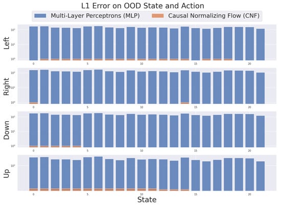 As depicted in Figure 5, the CNF model demonstrates an accurate capture of the system dynamics, resulting in a significantly reduced prediction error. This superior accuracy is attributed to its causal architecture, which enables it to learn the true data-generating mechanism rather than just superficial correlations. The substantial error gap between the models is evident in the OOD region where . When confronted with these unseen inputs, the standard MLP baseline fails to generalize, leading to catastrophic and erroneous predictions. The CNF, in contrast, remains robust, demonstrating its ability to effectively model system dynamics and produce reliable, accurate outputs even when extrapolating to unseen regions of the state-action space.