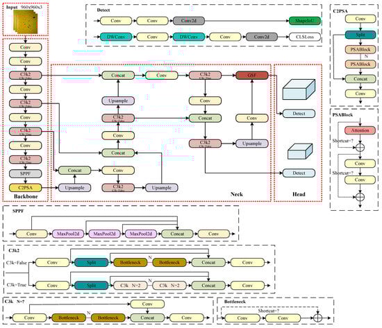 In this study, after multi-faceted considerations and extensive baseline comparisons, we adopt YOLO11 as the base model. Specifically, unless otherwise stated, our baseline is the official Ultralytics YOLO11n (nano) release; we follow the default architecture and training settings from the standard open-source Ultralytics YOLO11 implementation. YOLO11 offers a favorable speed–accuracy trade-off, a stable training–inference pipeline, and mature operator-level and engineering support [,,]. These properties make it suitable for targeted structural modification and lightweight deployment in a “single-class, tiny-target, edge-deployment” scenario of ACP on yellow-board. However, directly using the original architecture faces four key challenges: (1) the conventional P3 + P4 + P5 three-branch prediction causes resolution mismatch and redundant computation for very small targets; (2) the high-resolution branch is easily disturbed by yellow-board textures, stains, and other artifacts, and simple linear fusion can amplify noise and increase false positives; (3) CIoU does not sufficiently capture shape inconsistency or minor alignment errors on tiny boxes, which limits localization stability; and (4) for large-scale edge deployment, the original model still requires further compression in parameters, model size, and computation to reduce cost and ensure long-term reliable operation.