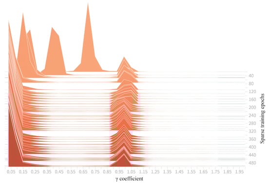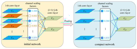 where and are the learnable scale and bias, and is a small constant for numerical stability. Thus, each serves as a multiplicative gate on the corresponding feature channel: when is small, the contribution of that channel to downstream layers is effectively suppressed. A sparsity regularization is imposed on the scaling factors so that some of them are driven close to zero, providing a criterion for channel importance. The structure is shown in Figure 7; during pruning, channels with large scaling factors (solid lines) are kept, and channels with small factors (dashed lines) are removed. This process guides channel-level sparsity during training, provides an explicit measure of channel importance, and achieves structured compression.