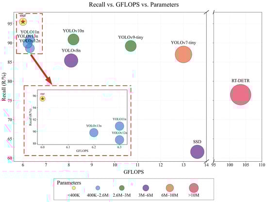 For an intuitive performance–cost view, Figure 11 maps recall, computation, and parameter count to the vertical axis, horizontal axis, and circle radius, respectively. The bubble for the proposed method lies in the upper-left region with a smaller radius: it achieves the highest recall under an approximately 6 GFLOPs budget. With a zoomed-in view, it is clearly separated from YOLO11n, YOLOv12n, and YOLOv13n, showing a recall advantage under smaller parameters and slightly lower computation.