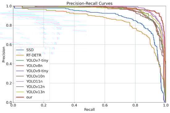 Precision–Recall curves of the detectors on the ACP-YSTD test set (input ). Vertical axis: precision; horizontal axis: recall. Curves closer to the upper-right indicate a more favorable precision–recall trade-off, especially in the high-recall regime required for early warning.