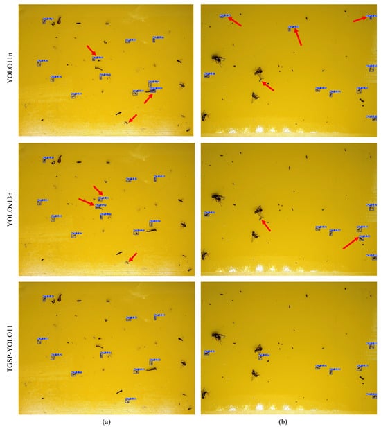 Qualitative comparison on ACP-YSTD. Panels (a) and (b) are images from the ACP-YSTD dataset; detections from YOLO11n, YOLOv13n, and TGSP-YOLO11 are shown on the same images. Red arrows indicate missed and false detections.