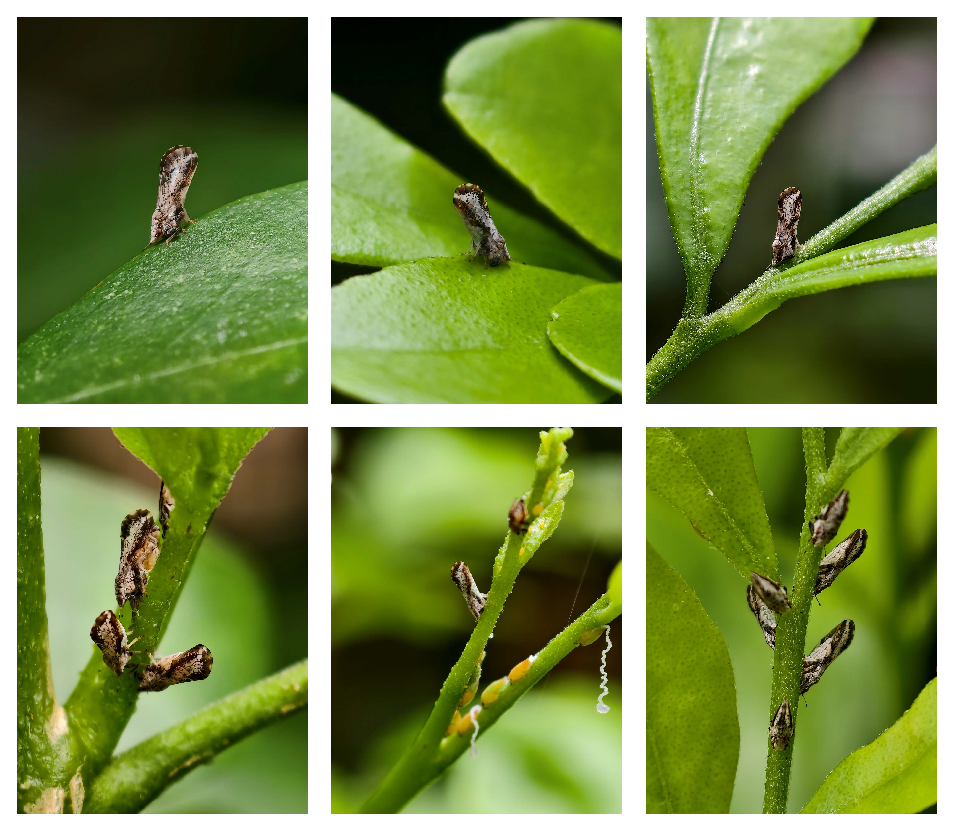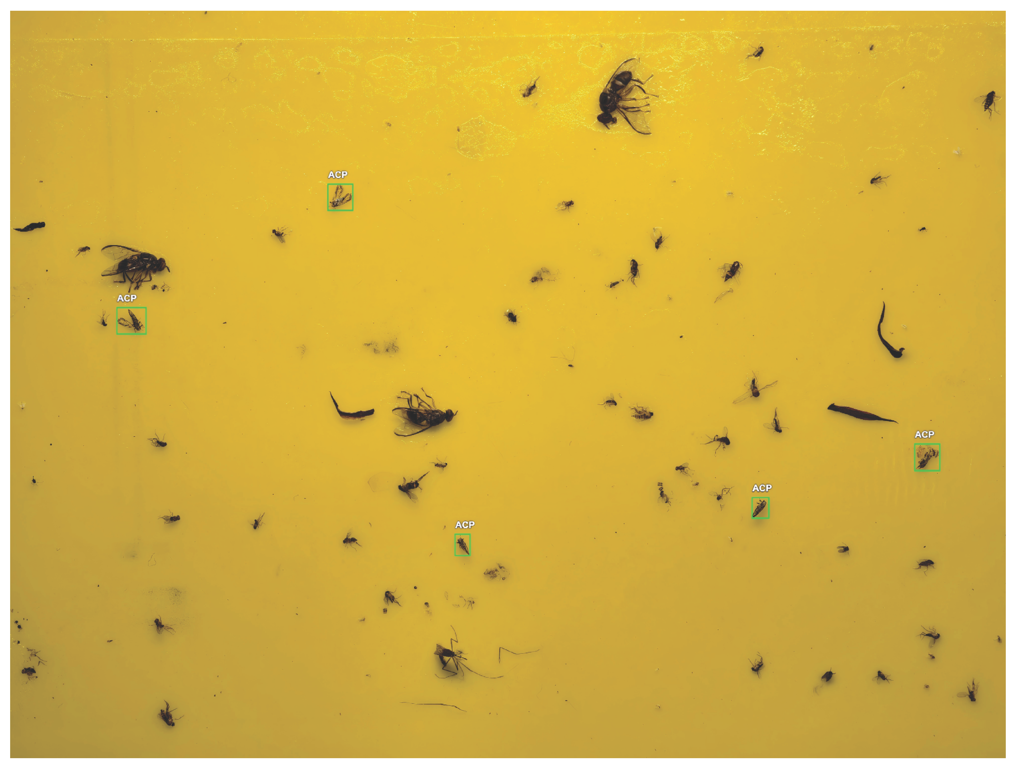 Figure 1. Adults are about 3 mm long. Their bodies are grayish green with brownish markings and covered with white wax. The targets are small and easily confused with the background. The data in this study were collected at an experimental plantation for citrus HLB in Haizhu District, Guangzhou, Guangdong Province, during June–August 2025. Yellow-boards (15 × 10 cm) were randomly hung within the orchard, with positions not limited to the canopy; different tree positions and heights were covered to enhance scene diversity. Each board was hung for 3–10 days per session. Multi-batch deployment and recovery were used to cover different time periods and environmental changes, enhancing the spatiotemporal representativeness of the samples. To obtain stable and clear images, the recovered boards were transported to the laboratory for imaging, reducing the impact of strong outdoor glare and shadows on image quality.