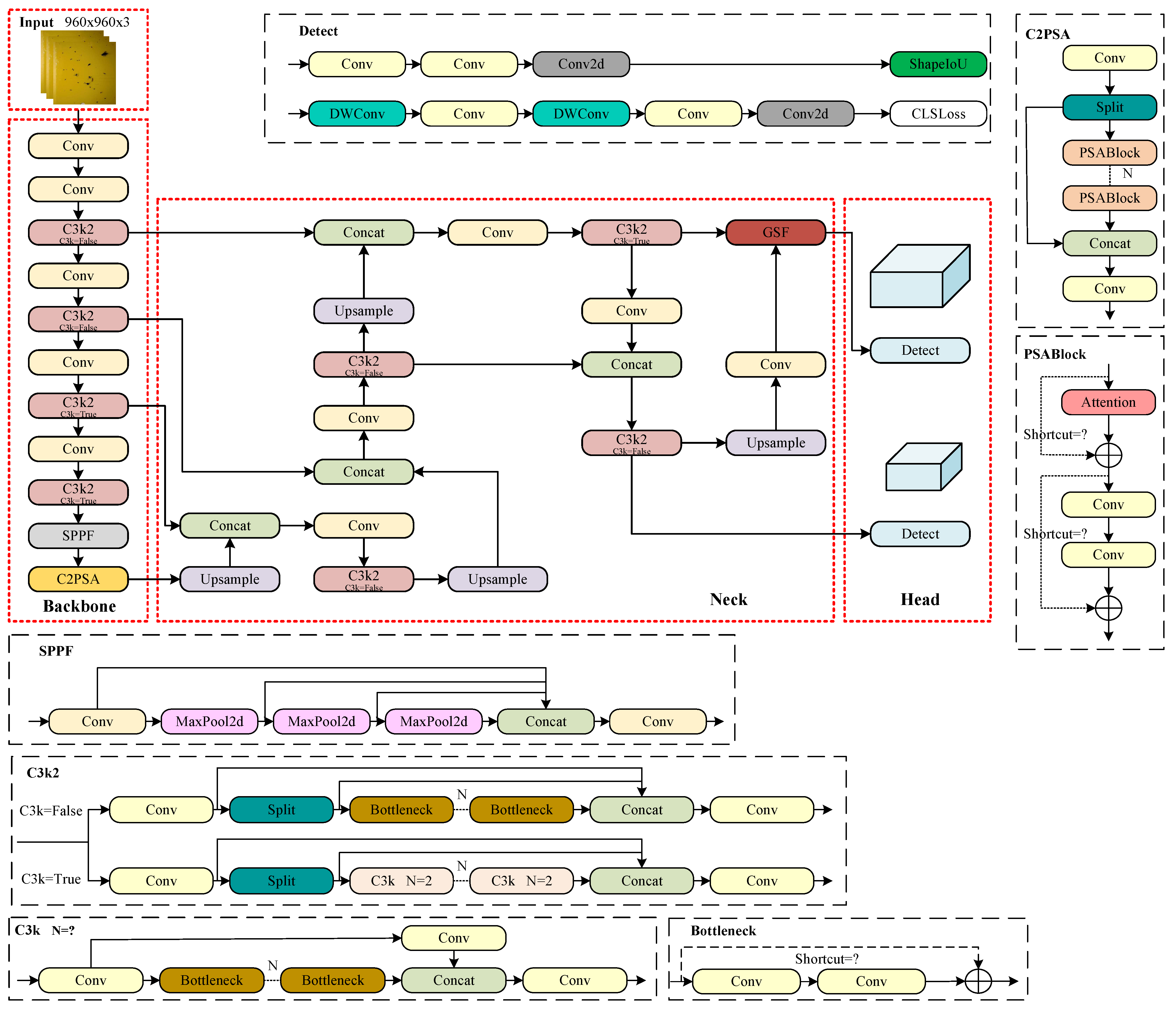 To address these trade-offs, the model input size was set to 960 × 960, ensuring consistency between training and inference. Compared with 640 × 640, 960 × 960 provides a higher effective pixel density for ACP of about 3 mm without changing the sample granularity, reducing information loss of small targets during scaling. At the same time, no cropping was performed, which avoids the same instance appearing across samples and the resulting risk of potential data leakage. During inference, the entire yellow-board image can be detected in one pass without extra tiling or sliding windows. This simplifies the deployment pipeline, reduces latency variability and engineering complexity, and better fits long-term online monitoring on edge devices. Overall, a unified 960 × 960 input achieves a more balanced trade-off between detection accuracy demands and computational budget, helping ensure the resolvability of small targets while maintaining stability and efficiency in training and inference.