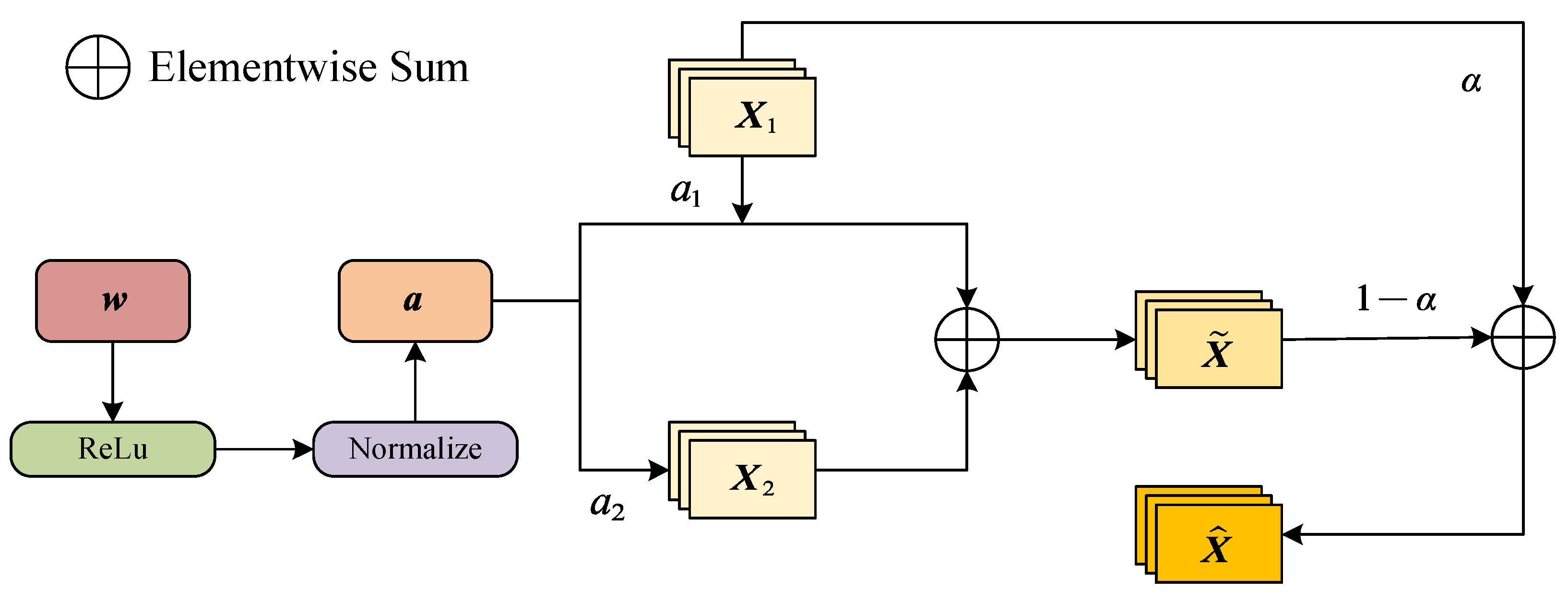 Using scalar broadcasting, the normalized combination of same-shaped tensors yields the intermediate fused tensor