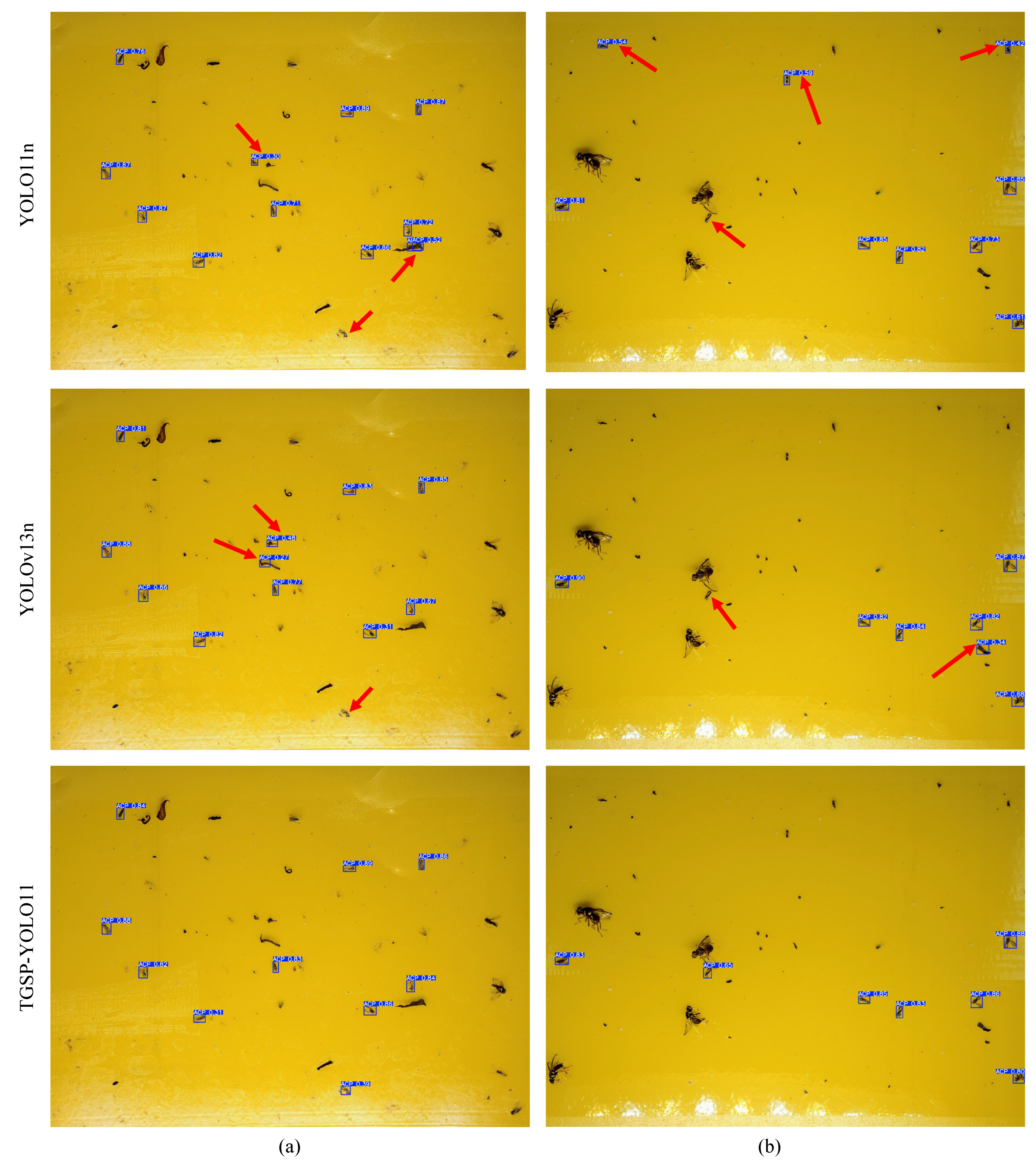 18] proposed YOLOv8-MC and built a remote monitoring system; the improved model achieved precision, recall, and F1 of 90.6%, 91.2%, and 91.0. These results suggest that a uniform background improves target contrast and reduces background interference, leading to more stable detection. However, issues such as insect adhesion, occlusion, and glare on the glue surface persist, requiring improved small-target separation and fine-grained representation.