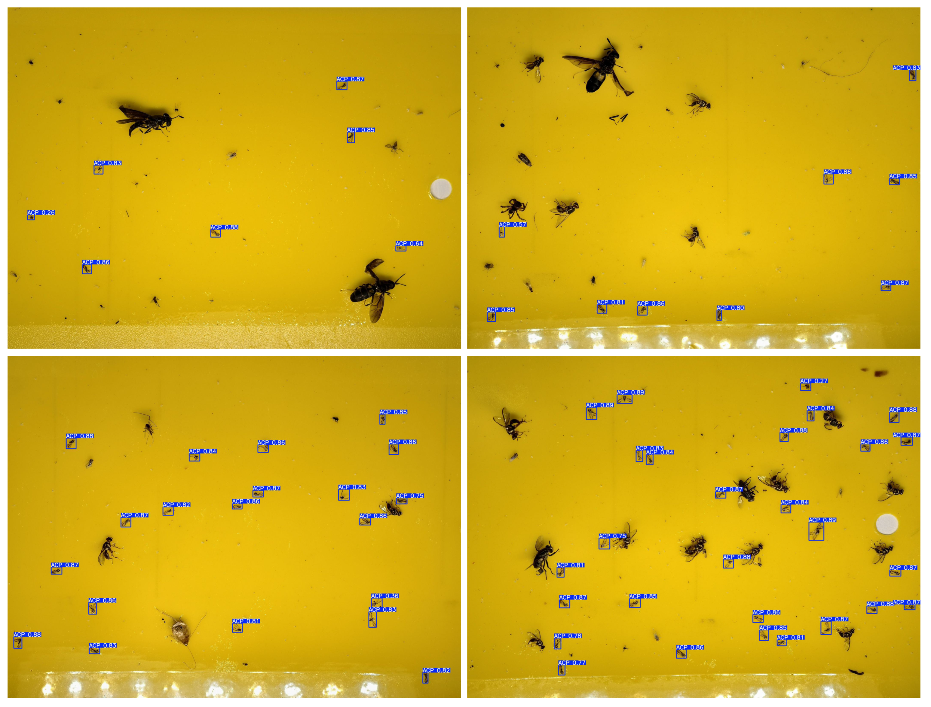 A high-definition macro-imaging protocol was used. The working distance between the camera and the board was kept within 28–35 cm. The resolution of a single image was 3072 × 4080 pixels. Fixed fill lights were used in the laboratory to provide consistent illumination against a uniform background. Basic quality control was performed, and images with obvious defocus or severe glare were removed. In total, 600 high-definition yellow-board images were obtained to form the ACP-YSTD. On this basis, high-quality manual annotation was performed and strictly reviewed according to unified guidelines. An annotation example is shown in