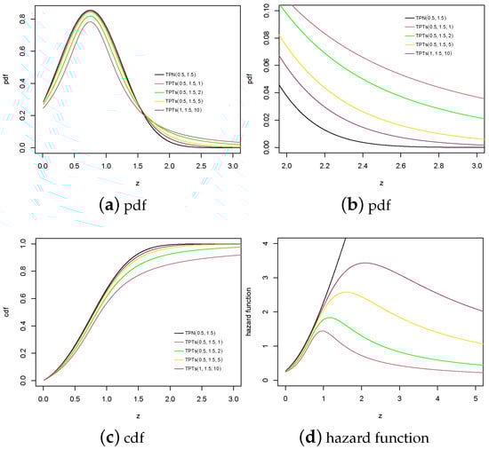 Figure 1 presents the pdf, cdf, and hazard function for the TPT model, considering various values of . The TPT model can exhibit heavier tails in the pdf compared to the TPN model, while the hazard function may assume more bell-shaped forms. Furthermore, we observe that, for specific values of , the pdf increases more gradually at specific points. This behavior arises because the TPT model, due to its heavy tails, converges more slowly to its limiting values, although all functions eventually tend toward one as z increases.
