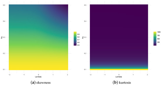 The TPT model exhibits heavier tails than other models. However, the traditional kurtosis coefficient (defined in terms of moments) for the TPT model exists only for . Therefore, in the range where the model acts better (where it produces the heaviest tails, i.e., ), the comparison is not possible. Due to this feature, studying the behavior of the kurtosis (and skewness) coefficient requires an alternative approach, such as those proposed below. A classical measure of skewness was introduced by MacGillivray [26], and is given by