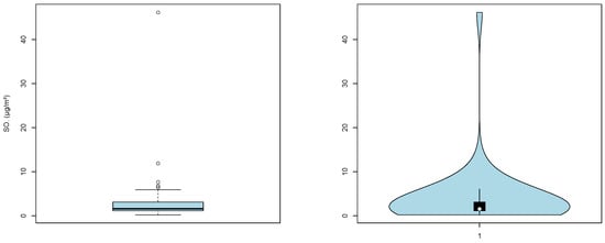 Boxplot of SO2 concentrations (left panel) and violin plot of SO2 concentrations (right panel).