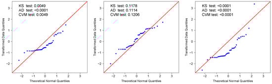 In summary, the results indicate that the TPT distribution provides the best overall fit among the models considered. Relative to the TPN distribution, the inclusion of the additional shape parameter in the TPT model enables more flexible modeling of the heavy-tailed behavior observed in the SO2 data. Likewise, compared with the GG distribution, the TPT achieves an effective trade-off between goodness of fit and parsimony, reinforcing its suitability within the family of truncated positive models. Figure 5 displays the Q–Q plots for the three candidate models, confirming that the TPT distribution aligns most closely with the empirical quantiles and provides a robust characterization of the observed SO2 concentrations.