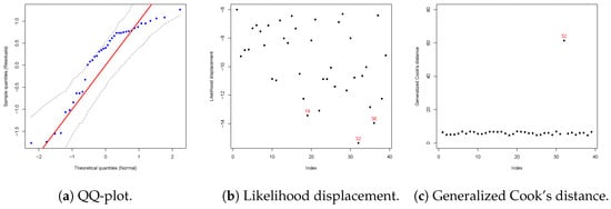 Diagnostic plots for the RTPT regression model at the 80th percentile (). Panel (a) shows the quantile residuals, indicating that the model adequately captures the distributional characteristics. Panel (b) presents the likelihood displacement, identifying potentially influential observations, with some stations exerting greater influence on the model fit. Panel (c) displays generalized Cook’s distance, highlighting the most influential points, with observation #32 being the most prominent.