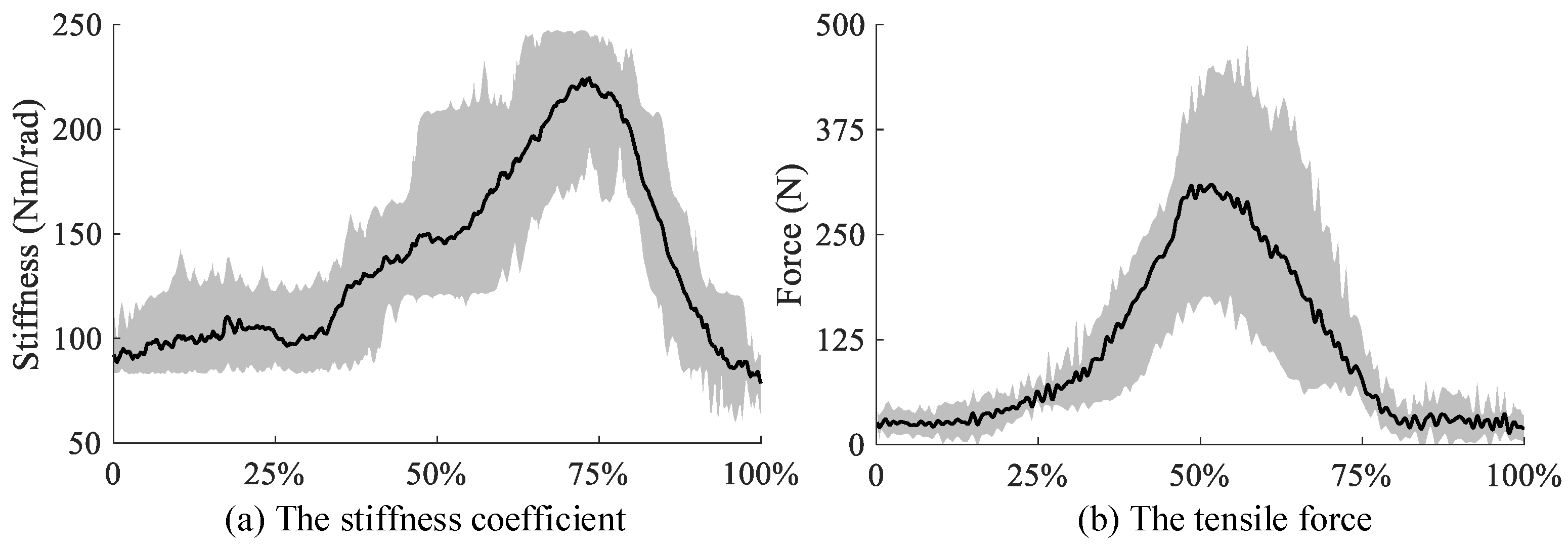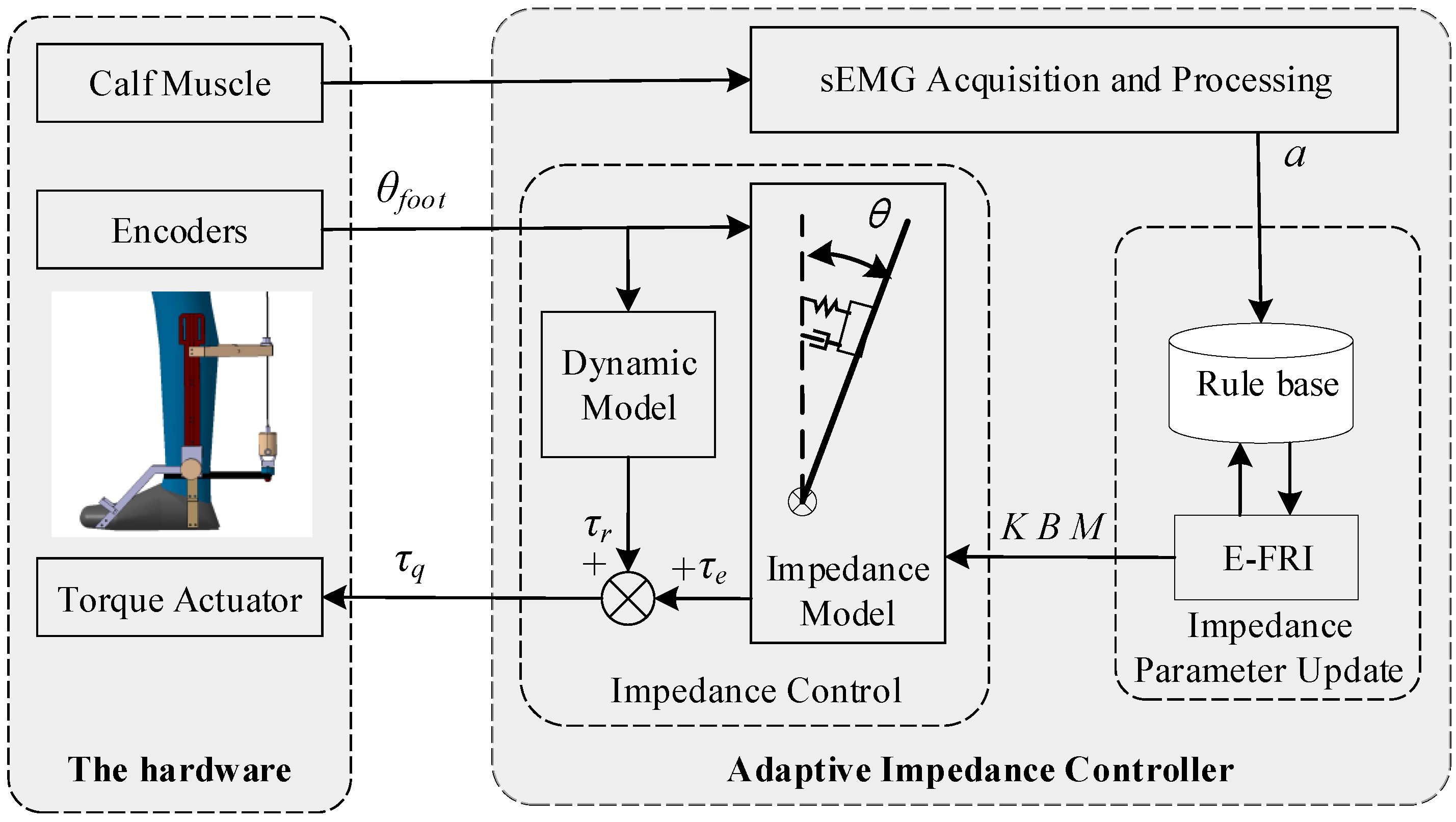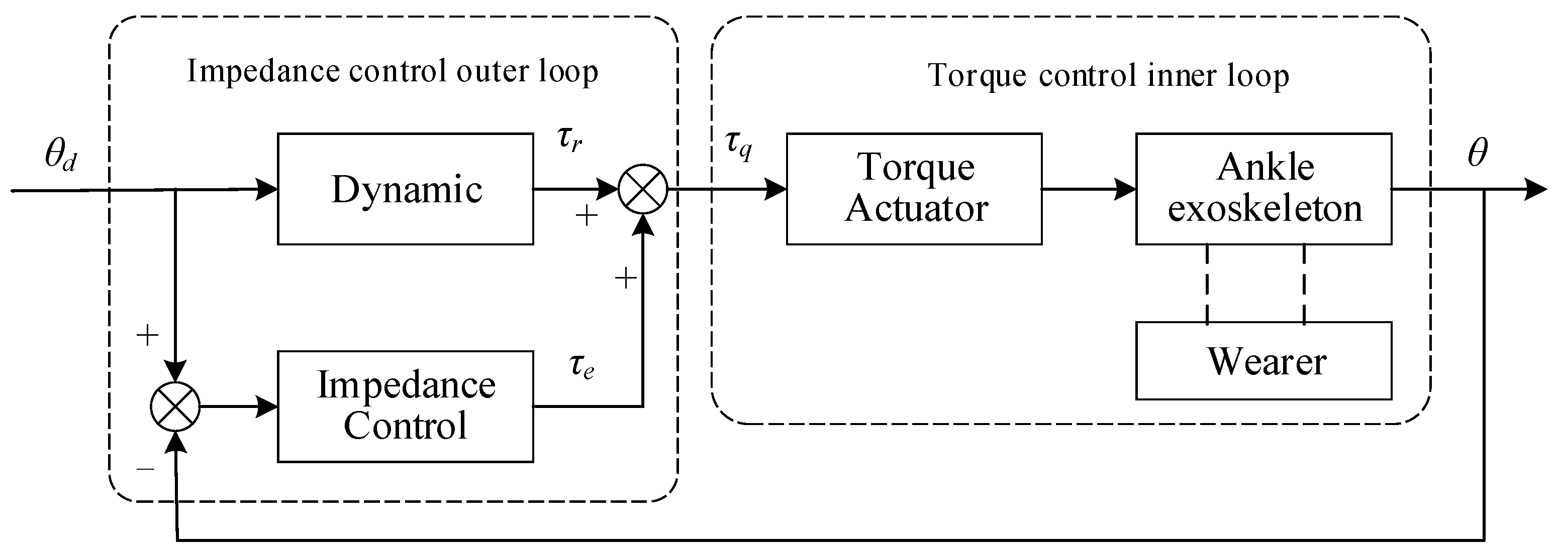 - The ankle exoskeleton is regulated by the traditional impedance control approach. In the traditional impedance control method, throughout the control process, the impedance parameters do not vary according to the different interaction states between the wearer and the exoskeleton. The stiffness N·m/rad was derived from biomechanical studies on healthy ankle dynamics [26]. The damping N·m·s/rad obtained by Equation (11). And the inertia kg·m2/rad reflected the exoskeleton-human system average inertial property. The desired assistance torque can be computed using Equation (5).