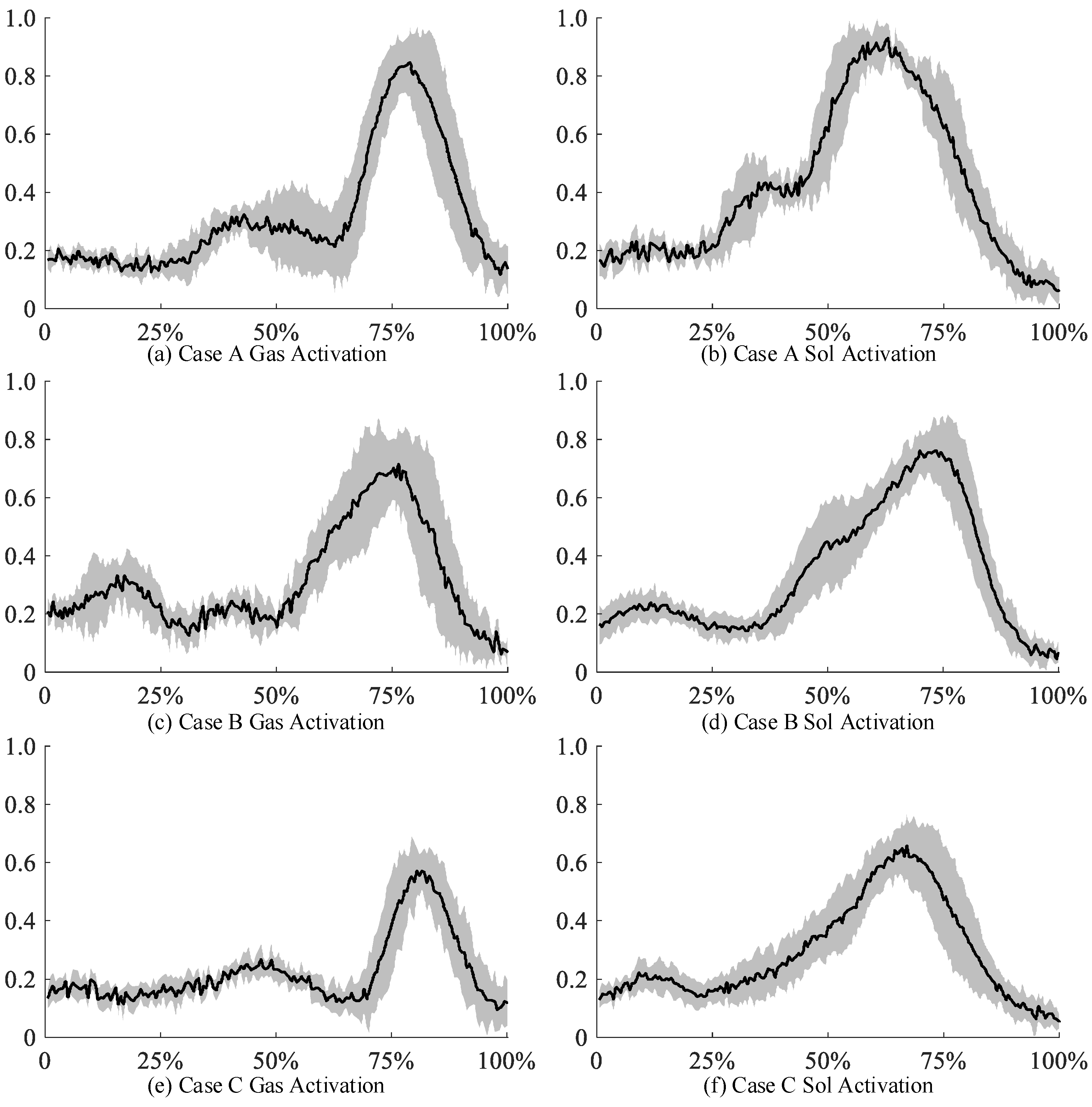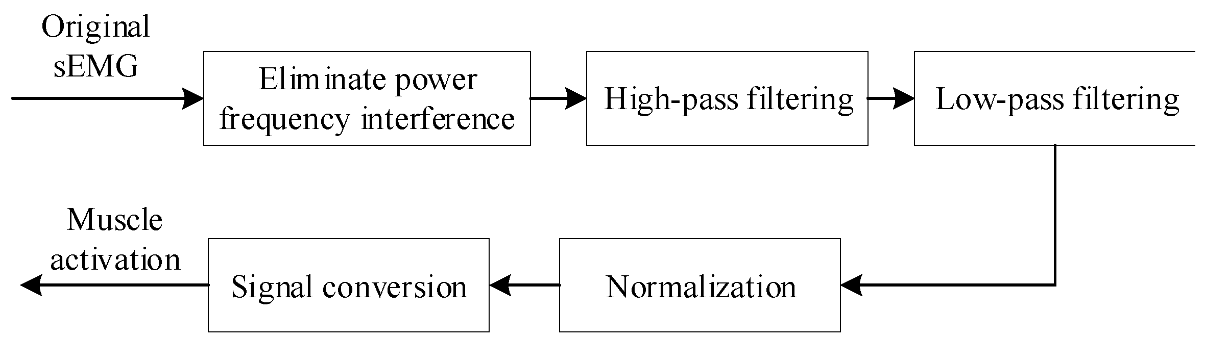 - The sEMG signal is transformed into the muscle stimulation signal by using the second-order difference equation, which can be expressed as:where d represents delay of sEMG signal, , , are the paraments of the second-order difference equation. In this work, the parameter values d = 10 ms , , were derived from electromechanical delay measurements and stability constraints of the difference equation. In addition, the muscle stimulation signal is transformed into muscle activation by nonlinear processing. This process is expressed as:where A is a nonlinear processing factor with a value range of −3 to 0, in this work .