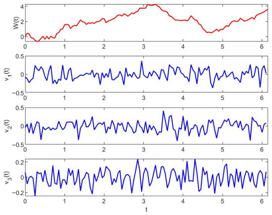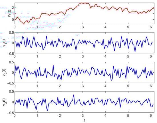 Figure 5 shows the profiles of exogenous disturbances , , , and Brownian motion to which systems (25) and (26) are subjected. The trajectories of each component of the suggested control of (25) are illustrated in Figure 6, which is divided into 3 stages. The contrast between and shown in Figure 7 and Figure 8 illustrate the change in errors between and with . In the firs stage, i.e., , system (25) is no control input, where . Figure 7 and Figure 8 illustrate that the distance between and is the farthest; i.e., the values of errors are worst in the first stage. In the second stage, i.e., , the control input of system (25) is state-feedback control. By Figure 7 and Figure 8, we see that, compared with the first stage, the values of errors with become smaller but still not very good. In the third stage, it is easy to see that the errors between and become the smallest when , which is shown in Figure 7 and Figure 8.