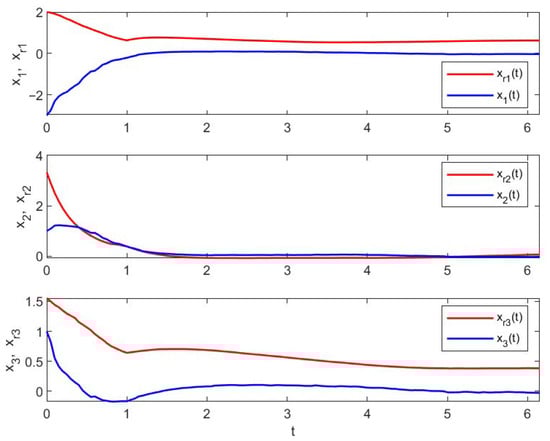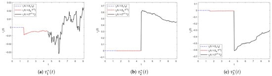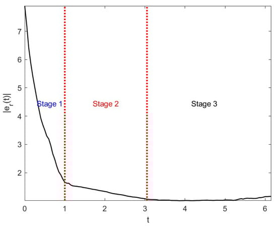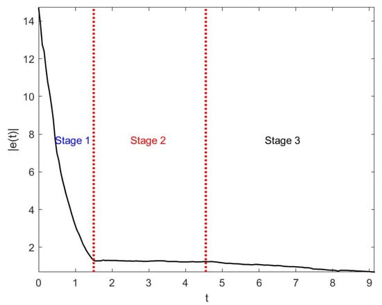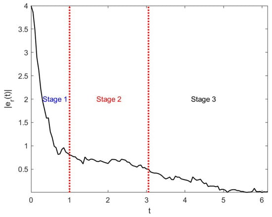 Figure 10 illustrates the trajectories of control with three stages. Figure 11 shows the trajectories of and reference under the control designed above. It is easy to see that each component of performs well regarding the reference . Figure 12 illustrates the error’s changes between and , showing that there exists the smallest error in the third stage, which verifies the effect of the proposed method.