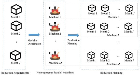 HPMPP involves allocating predetermined monthly production targets to a set of heterogeneous parallel machines (furnaces). Given the monthly rollover penalty factors, machine maintenance schedules, capacity limits, and deep learning-predicted carbon emission factors, the objective is to determine the monthly capacity allocation across machines that optimizes the three objective functions detailed below.
