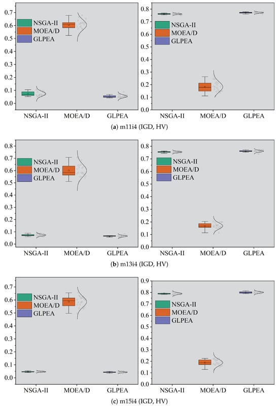 Box plots for NSGA-II, MOEA/D, and GLPEA.