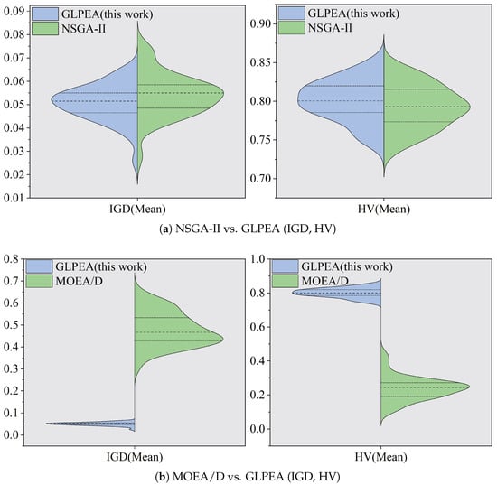 Violin plots for MOEA/D, NSGA-II, and GLPEA (Mean).