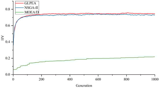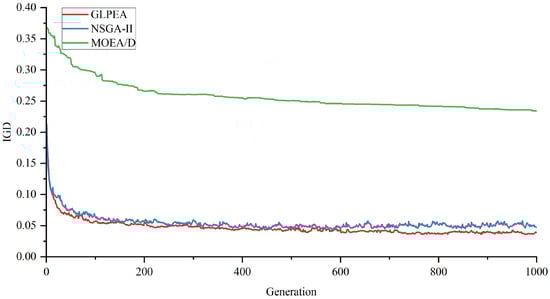As shown in Figure 8 and Figure 9, GLPEA consistently achieves lower IGD values and higher HV values than NSGA-II and MOEA/D throughout the whole iterative process. This indicates a smaller distance to the reference Pareto front and a broader coverage of the objective space, collectively confirming GLPEA’s superior capability in exploring diverse regions of the Pareto front.