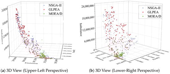 Based on the distributions of obtained APFs shown in Figure 10, GLPEA achieves superior uniformity and coverage across all three objectives in the Pareto front, outperforming NSGA-II (which ranks second) and MOEA/D (which shows the weakest performance in both coverage and distribution uniformity). Moreover, these results reflect inherent conflicts among the three optimization objectives: emission control, rollover penalty costs, and load balancing. As a result, a significant improvement in one objective generally leads to deterioration in the others, resulting in a dispersed Pareto front rather than a single optimal solution.