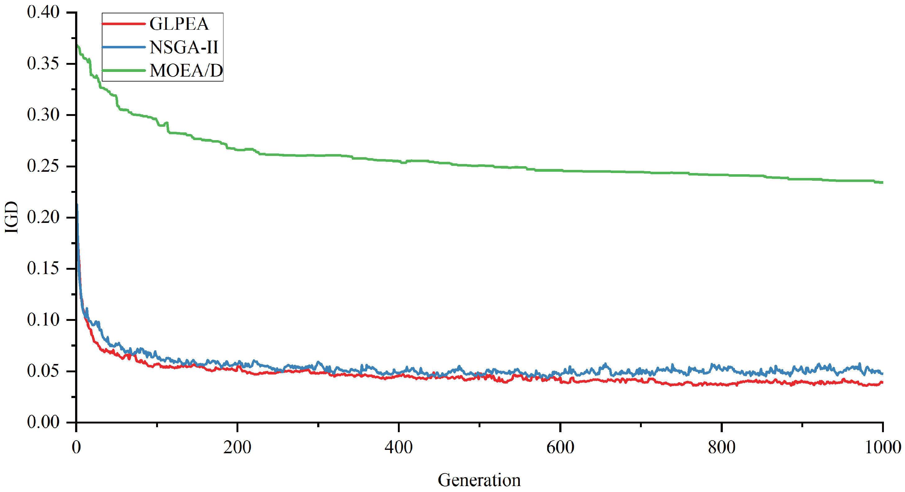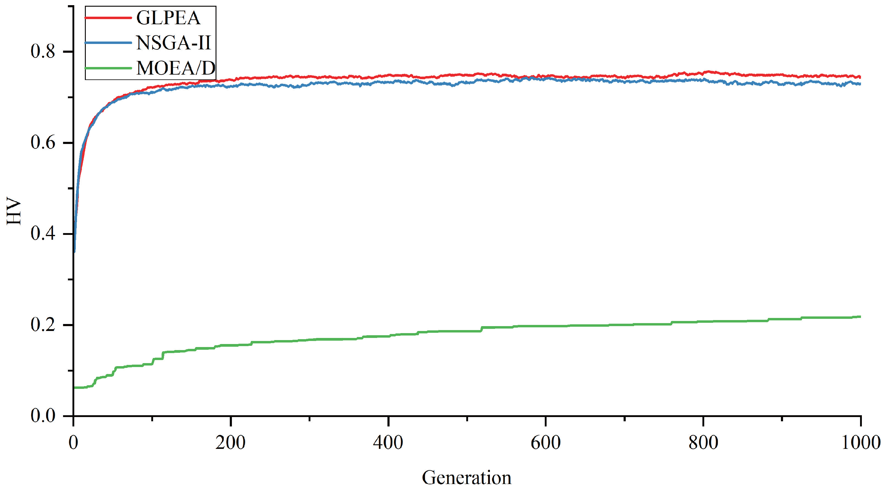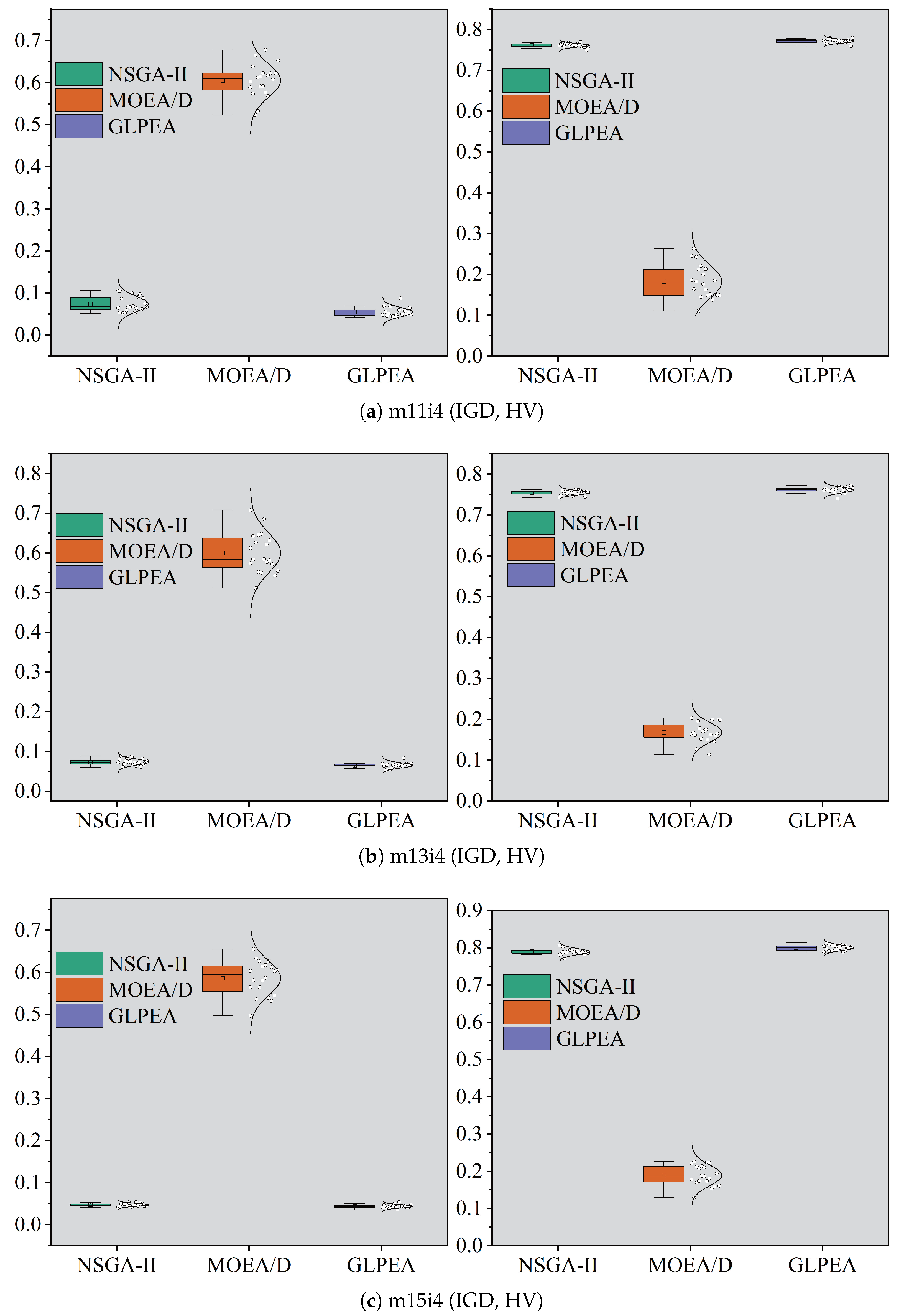 5.7.1. Trends of IGD and HV Achieved by GLPEA, NSGA-II, and MOEA/D