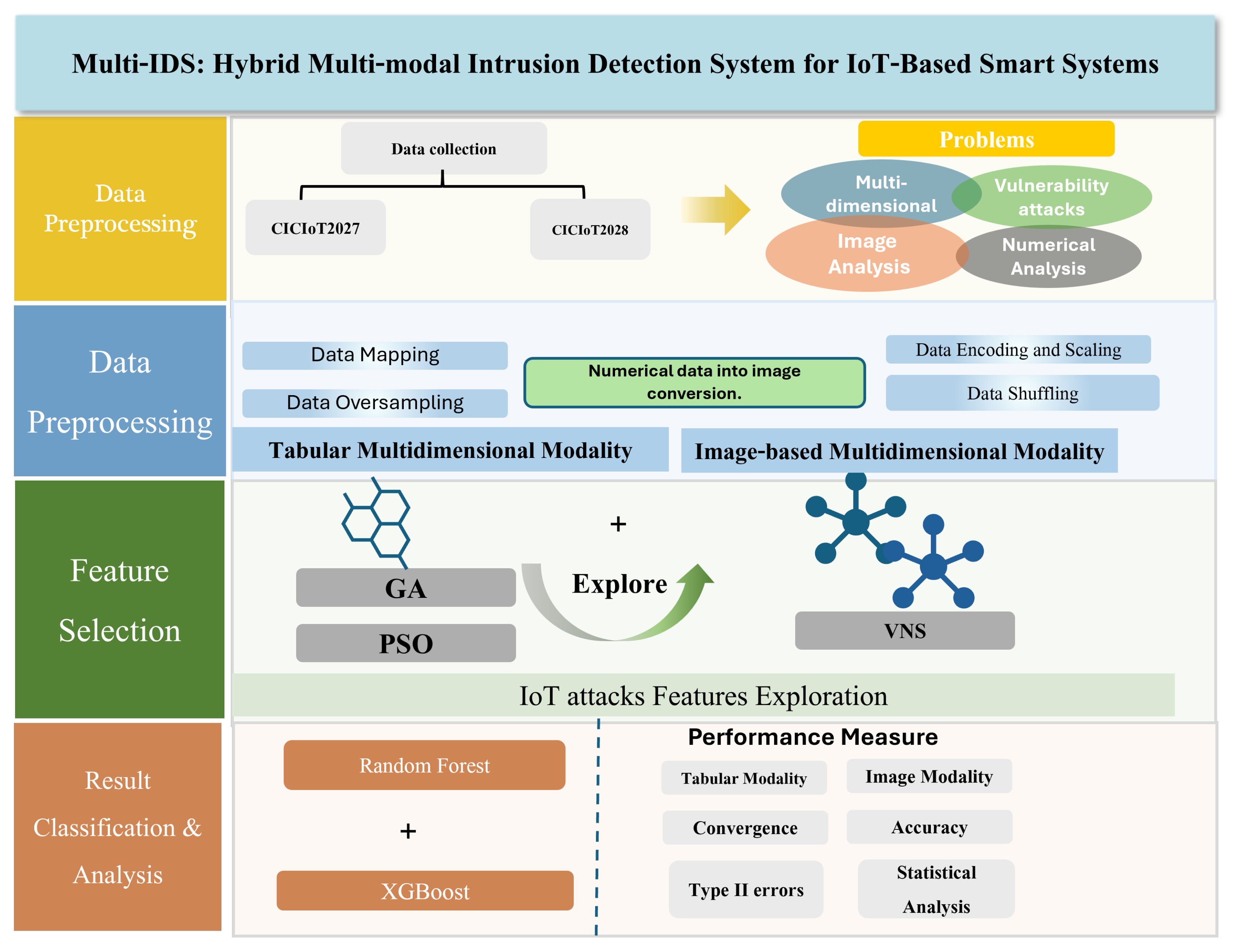 Combining XGBoost with Variable Neighborhood Search yields the most equitable and efficient categorization across the sample set. VNS-RF (3822 total FN) models are prone to type 2 errors. This is the most significant security mistake. The model is essentially blind to thousands of attacks when the number of FNs is high. The most important contributor to FNs for the RF models was the system’s failure to detect infiltration attempts, allowing an attacker to enter the network without triggering an alarm. With an FN count of 212, VNS-XGBoost had the lowest FN count of all the candidates. The use of this methodology significantly reduces the probability of a significant security breach because fewer threats are detected. A parallelized tree ensemble in XGBoost handles heterogeneous data distributions with minimal overfitting, and a local search in VNS maximizes discriminative feature subsets for each attack class. In addition to improving the model’s ability to distinguish between overlapping attack patterns, the spatial feature representation enhanced its ability to detect minute variations across visually similar incursion profiles. However, there are a few limitations. It is most likely that the model’s recall was erratic across closely related classes, such as DoS and DDoS, because the samples shared specific statistical and temporal characteristics. Further, since feature importance and class boundaries may change dynamically in large, streaming IoT systems, model interpretability and scalability may be limited. Although VNS is a computationally efficient method, it still requires manual parameter adjustments to maintain neighborhood variety and to avoid convergence stagnation. Despite these limitations, the results show that the VNS–XGBoost pipeline produces an exceptionally accurate and computationally efficient intrusion detection (IDS) system that supports strong multiclass detection and cross-dataset generalization without the complexity of deep learning architectures. The results of this study demonstrate that the model can be applied to IoT intrusion-detection deployments where speed, explainability, and adaptability are significant.