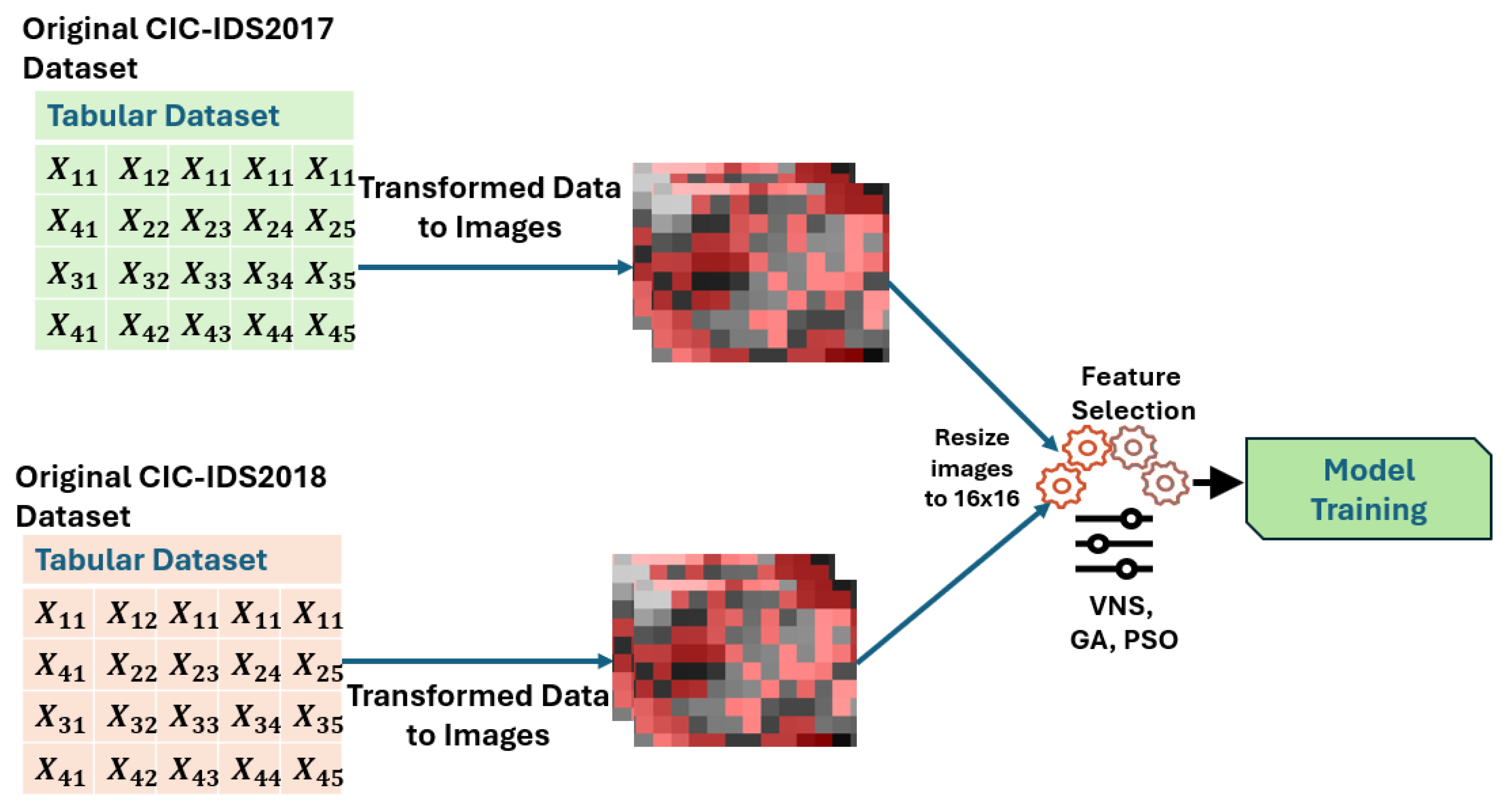 Table 11 summarizes the feature reduction achieved by the intrusion detection models using the CSE-CIC-IDS2018 dataset, with an original feature count of 256 (derived from 16 × 16 image representations). The PSO-XGBoost model achieved the highest reduction, selecting 130 features and yielding 49.22%. The GA-RF model followed closely, selecting 131 features, resulting in a 48.83% reduction. Both GA-XGBoost and VNS-RF, along with VNS-XGBoost, selected 137 features each, resulting in a 46.48% reduction, while PSO-RF selected 135 features with a 47.27% reduction. These results indicate that all models effectively reduced the feature set by approximately 46–49%, with PSO-XGBoost being the most efficient in minimizing the number of features while maintaining performance. For IDS2017, GA-XGBoost achieves the highest reduction percentage (50.39%, selecting 127 features), closely followed by VNS-XGBoost (50.00%, 128 features), demonstrating their effectiveness in identifying compact, high-performing feature subsets, leveraging GA’s evolutionary search and VNS’s systematic neighborhood exploration, respectively, paired with XGBoost’s gradient boosting optimization (n_estimators = 100, learning_rate = 0.1). The VNS-RF model recorded the shortest training time at 1 min 6 s, while VNS-XGBoost had a slightly longer training time of 1 min 14 s. For optimization time, VNS-XGBoost was the fastest, taking only 12 min 15 s, followed by VNS-RF at 20 min 53 s. In contrast, the GA-XGBoost model had the longest optimization time at 6 h 11 min 4 s, despite a relatively short training time of 1 min 6.5 s. The PSO-XGBoost and PSO-RF models required 5 h 24 min 26 s and 3 h 22 min 14 s for optimization, respectively, with training times of 1 min 56.2 s and 1 min 52.6 s. The GA-RF model took 3 h, 1 min, 6 s for optimization and 1 min, 20.8 s for training. These results highlight that VNS-based models, particularly VNS-XGBoost, are significantly more efficient in terms of optimization time, making them highly suitable for practical deployment in intrusion detection systems.