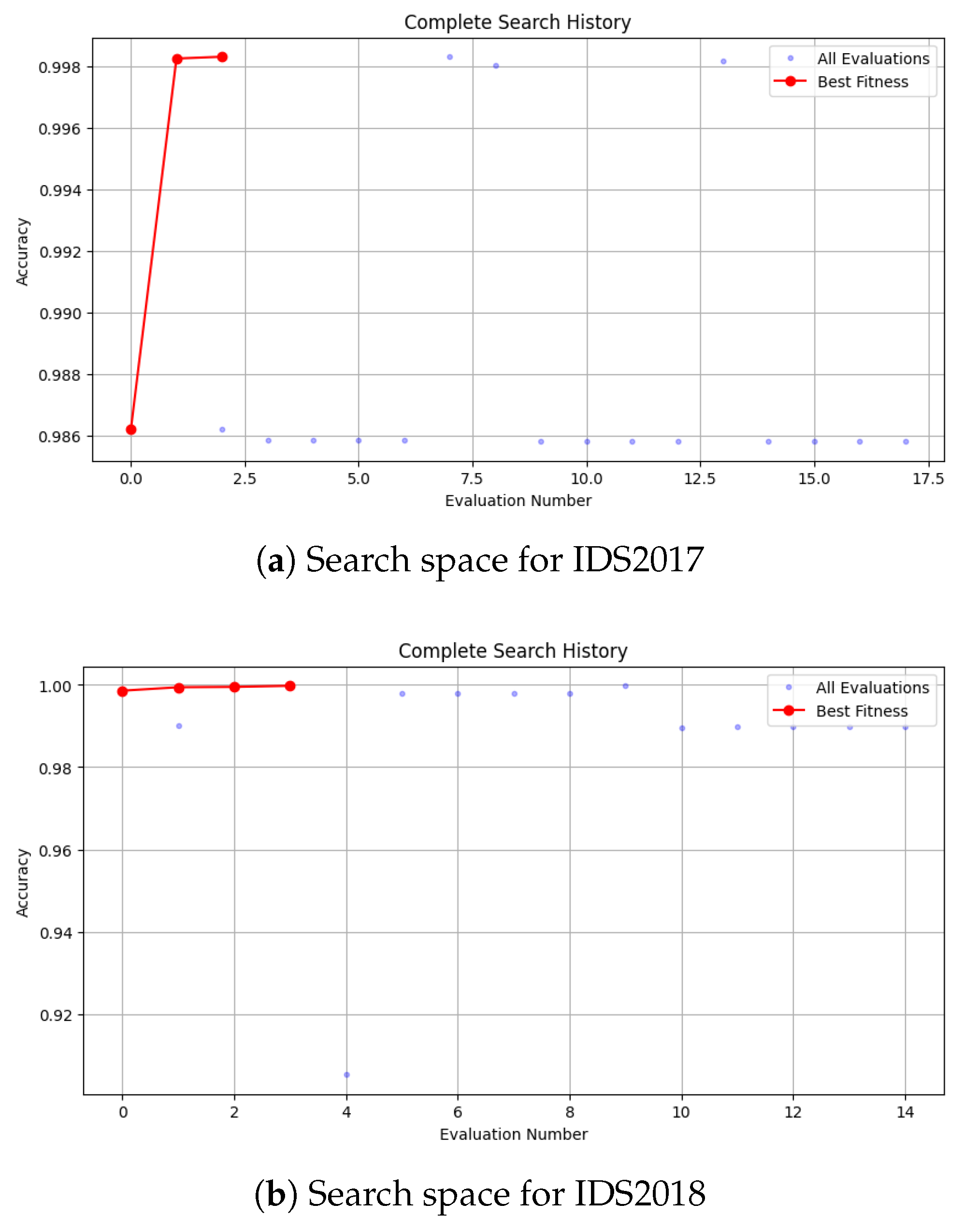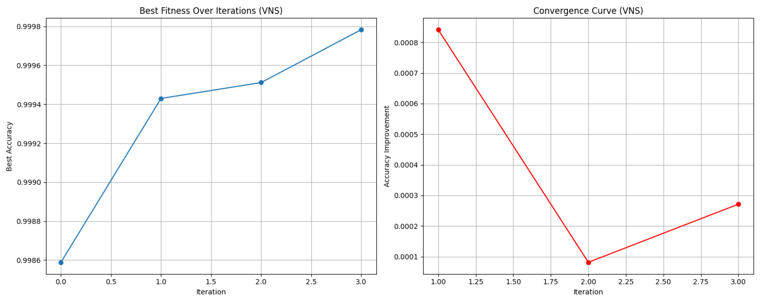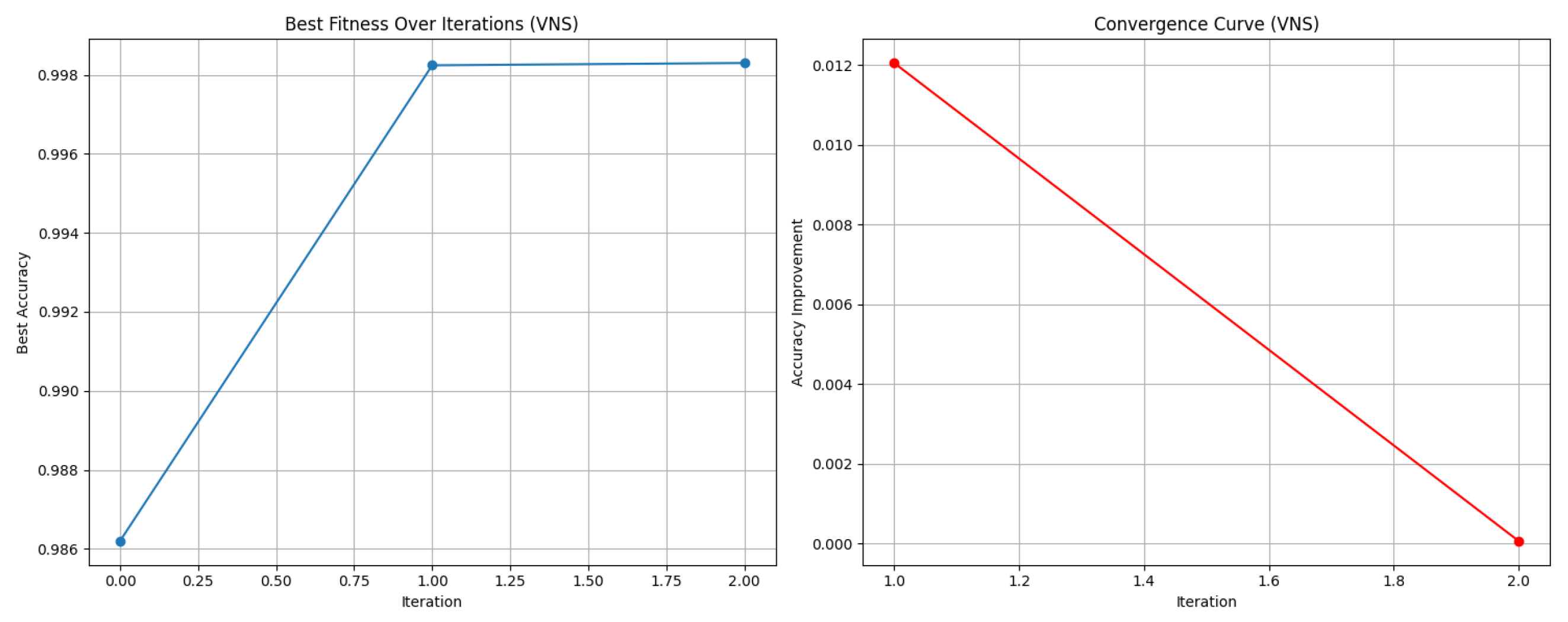 Figure 13) a notable upward trend, with the first solution achieving an accuracy of 0.986 and steadily increasing to 0.998 after approximately 17.5 evaluation iterations. This improvement demonstrates the versatility of VNS in high-dimensional search spaces and its ability to extract highly discriminative characteristics from various IoT traffic patterns. With little redundancy, the algorithm was able to separate significant feature subsets, as evidenced by the final configuration’s low Type II Error and False Positive rate of 4. The IDS2018 dataset, on the other hand, demonstrated greater stability. After 14 assessment cycles, the accuracy plateaued at 0.990, indicating that fewer neighborhood expansions were needed to achieve optimal performance in the current dataset, which had more uniform traffic distributions and fewer minority classes. The consistency of results across datasets confirms the stability and dependability of the single-objective VNS optimization strategy. In addition, the convergence behavior demonstrates that the search procedure retains significant generalization capacity across years while adapting successfully to the inherent complexity of each dataset.