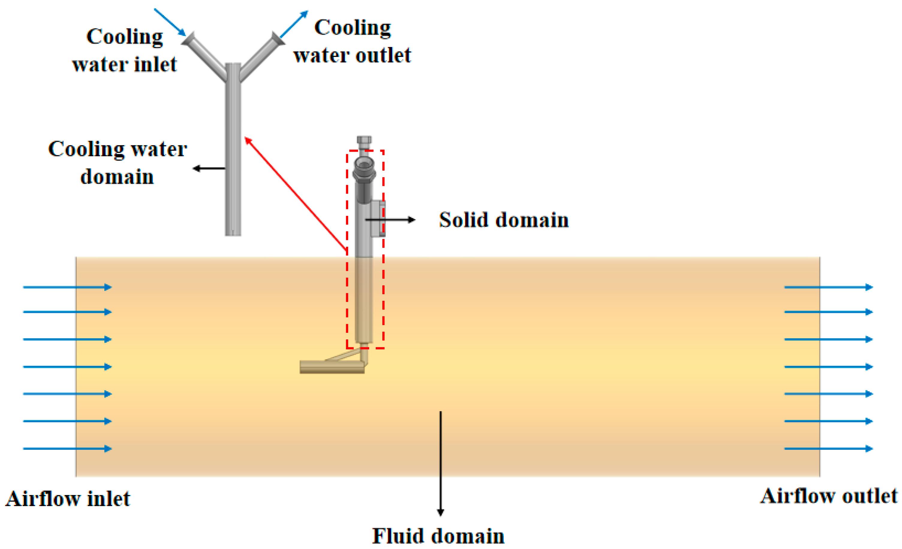 According to the physical characteristics of the total temperature probe, the calculation domain is divided into three parts: the first part is the air fluid domain in contact with the sensing part of the probe, the second part is the cooling water domain involved in the total temperature probe cooling, and the third part is the solid domain of the total temperature probe structure. The structure diagram is shown in Figure 2, where the air fluid domain is consistent with the actual test environmental parameters of the total temperature probe.