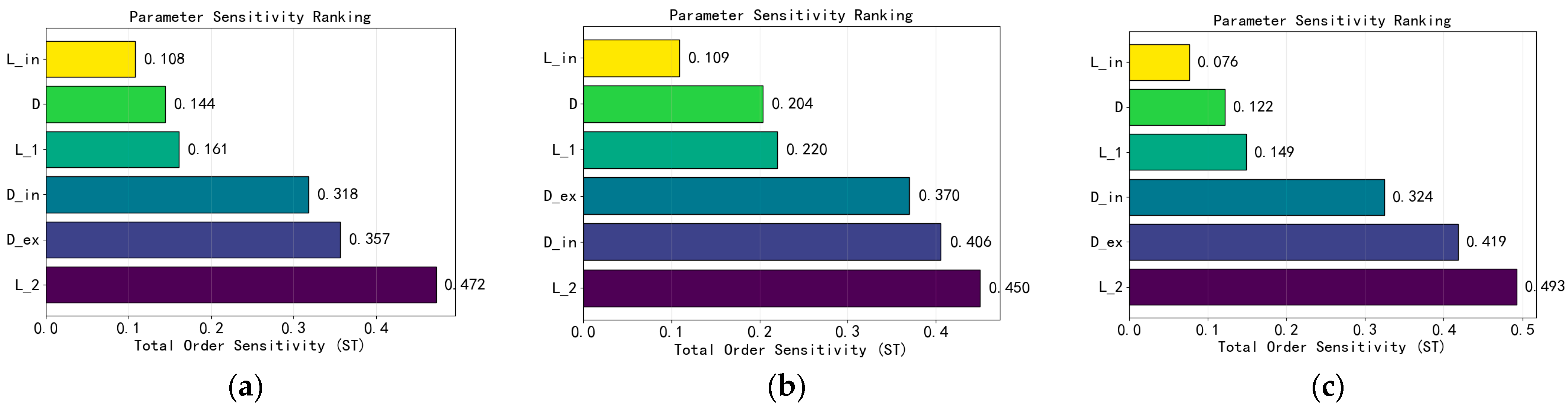 The medium-sensitivity parameters L _ 1 and D , with ST values in the 0.12–0.22 range, require consideration of their interaction effects with other parameters during optimization. Regarding low-sensitivity parameters, all three models consistently identified L _ i n as having the least influence (ST < 0.12), suggesting it can be assigned lower priority during the optimization process while focusing computational resources on more sensitive parameters.