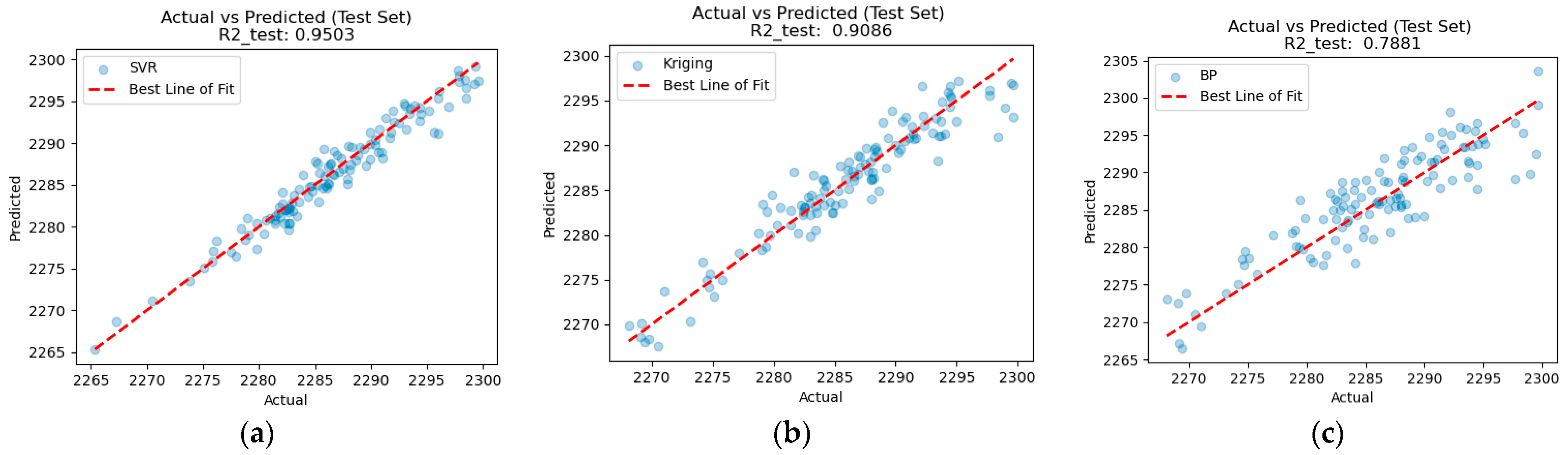 Figure 11. (a) The model performance of the SVR model on the testing set; (b) The model performance of the Kriging model on the testing set; (c) The model performance of the BPNN model on the testing set.
