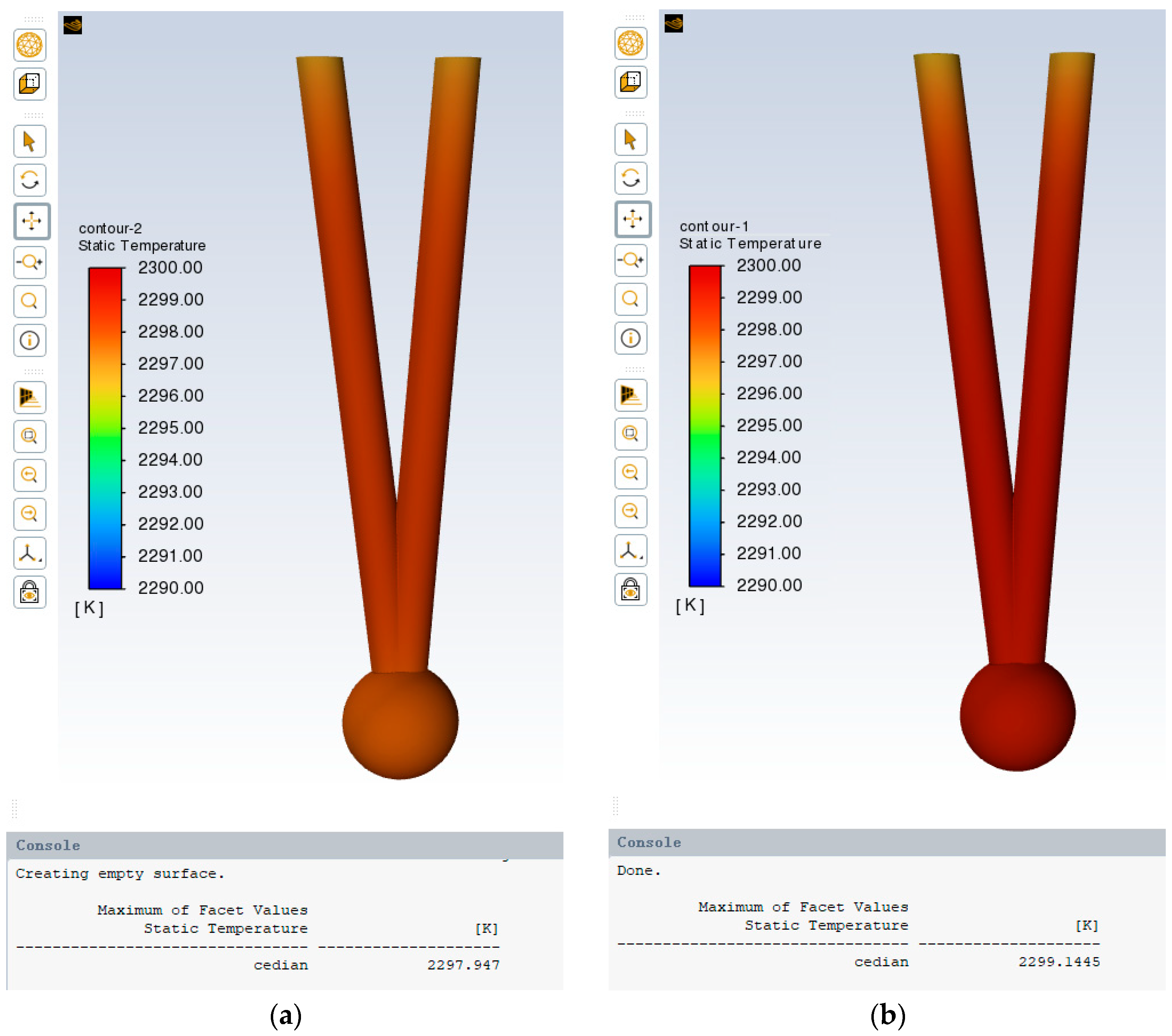 In the calculation conditions, the incoming flow Mach number within the domain is set to 0.6. The total temperature of the incoming flow is set to 2300 K, while the environmental pressure is maintained at 1.0 MPa. The cooling water flow rate is set to 1.0 kg/s. The heat transfer coefficient is 25 W/(m2·K), and the ambient temperature is 293.15 K. The emissivity of the shield is specified as 0.85, the emissivity of the probe wire is 0.9, and the emissivity of the ball welding is also set to 0.9.