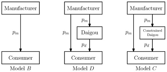 In this study, we use the following notation to describe the key variables and parameters. The manufacturer’s sales price is denoted by , while the daigou’s sales price is denoted by . In Models D and C, the parameters and are the asymmetric channel substitution parameters, where and represent the degree of substitution from the domestic daigou to the manufacturer and from the manufacturer to the domestic daigou, respectively. The superscripts are used to distinguish the models. In Models D and C, they incorporate the asymmetric channel substitution effects. Therefore, they capture the competitive dynamics between the formal manufacturer’s direct channel and informal daigou channels. From the channel competition and differentiation [40,41,42], these parameters ( and ) represent the degrees of substitutability between the two channels, where . Lower values of these parameters indicate weaker substitution; higher values represent near-perfect substitutability.