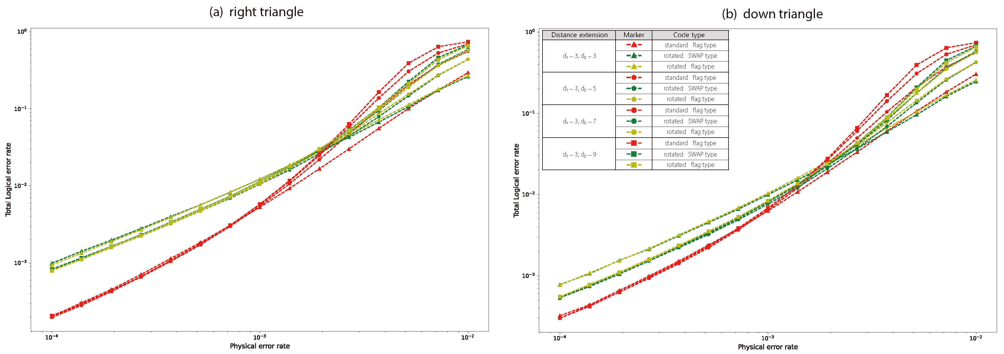 - Kim, Y.; Kim, H.; Kang, J.; Choi, W.; Kwon, Y. Effectiveness of the syndrome extraction circuit with flag qubits on IBM quantum hardware. arXiv 2024, arXiv:2403.10217. [Google Scholar] [CrossRef]