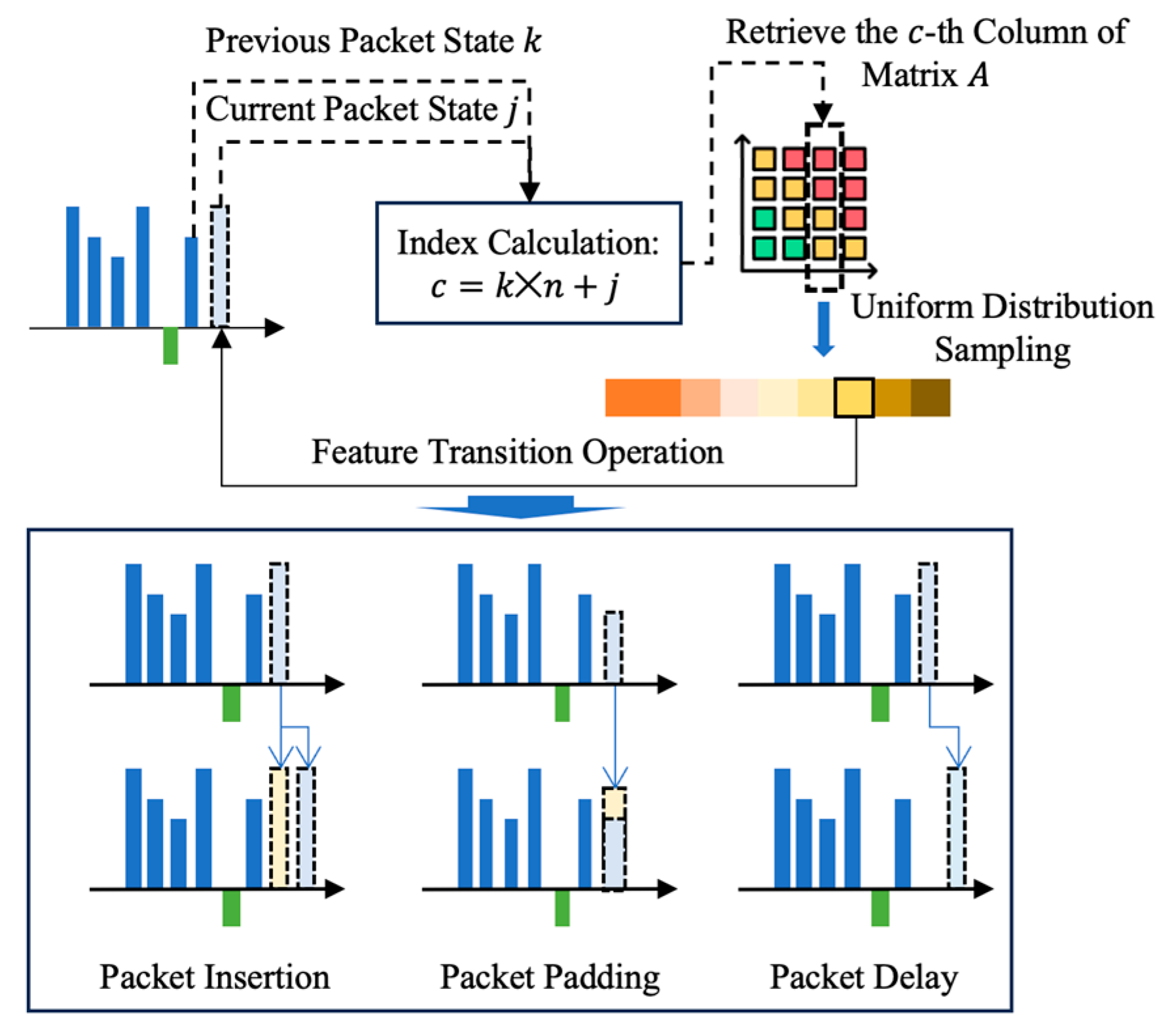 To accurately model the statistical and temporal dynamics of QUIC streaming traffic for covert data embedding, QuicCC-SMD employs a Markov chain-based transition probability matrix to characterize the evolution of traffic features over time. The transition matrix describes the likelihood of transitioning between discrete states, thereby capturing both packet-level temporal dependencies and statistical feature variations.