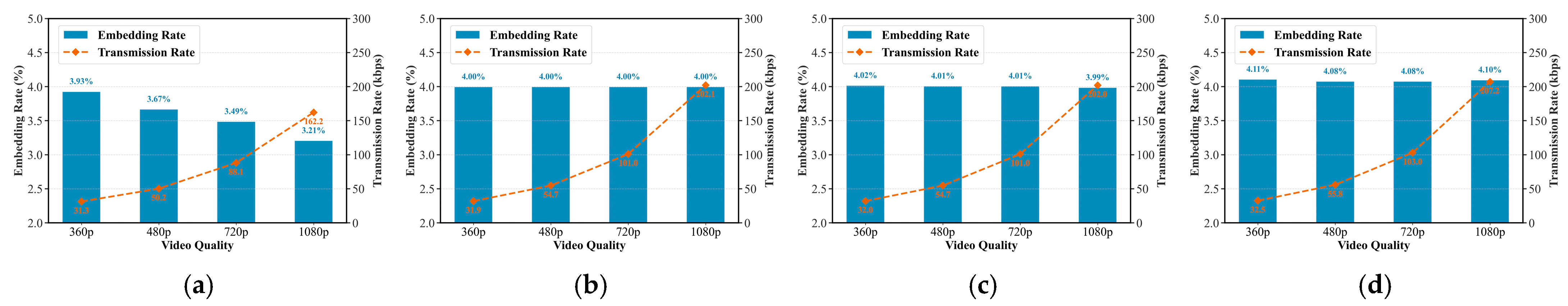 of QuicCC-SMD gradually decreases as video quality increases, with average values of 3.93%, 3.67%, 3.49%, and 3.21% for 360 p, 480 p, 720 p, and 1080 p, respectively. In contrast, the other baseline schemes maintain an embedding rate inherently close to 4%, because they apply fixed-rate or stochastic packet insertions without incorporating an embedding rate constraint. QuicCC-SMD, however, enforces the embedding threshold
