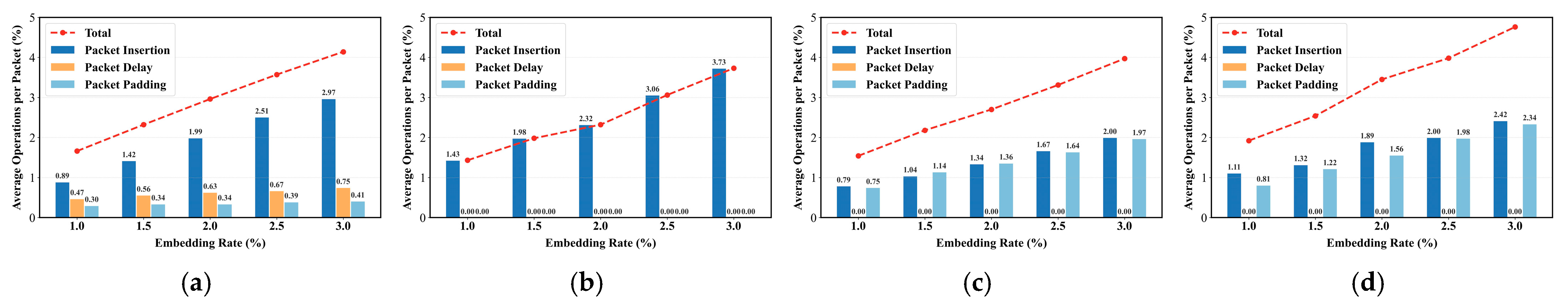 A deeper examination of QuicCC-SMD reveals that packet insertion is the primary component of its operational cost. It accounts for the majority of manipulations and increases steadily from 0.89% at a 1.0% embedding rate to 2.97% at 3.0%. This reflects the convex optimization design of the ADMM algorithm, which prioritizes minimally invasive operations, primarily packet insertion, while sparsity constraints suppress excessive delay or length modifications. In summary, QuicCC-SMD achieves efficient covert transmission by minimizing packet operations. This not only lowers detection risk but also reduces network overhead and system resource consumption, ensuring both stealth and practicality under diverse streaming conditions.