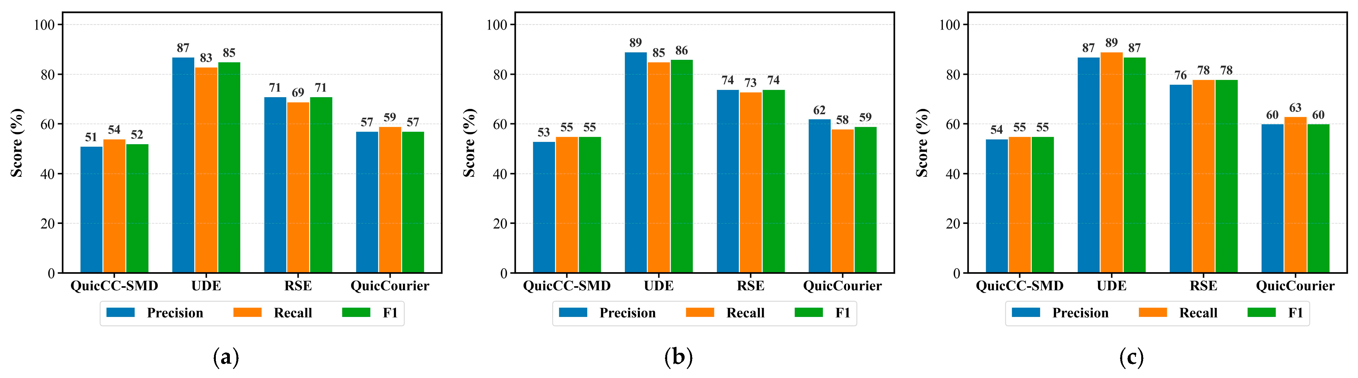 Figure 8 compares the detection performance of QuicCC-SMD, UDE, RSE, and QuicCourier.